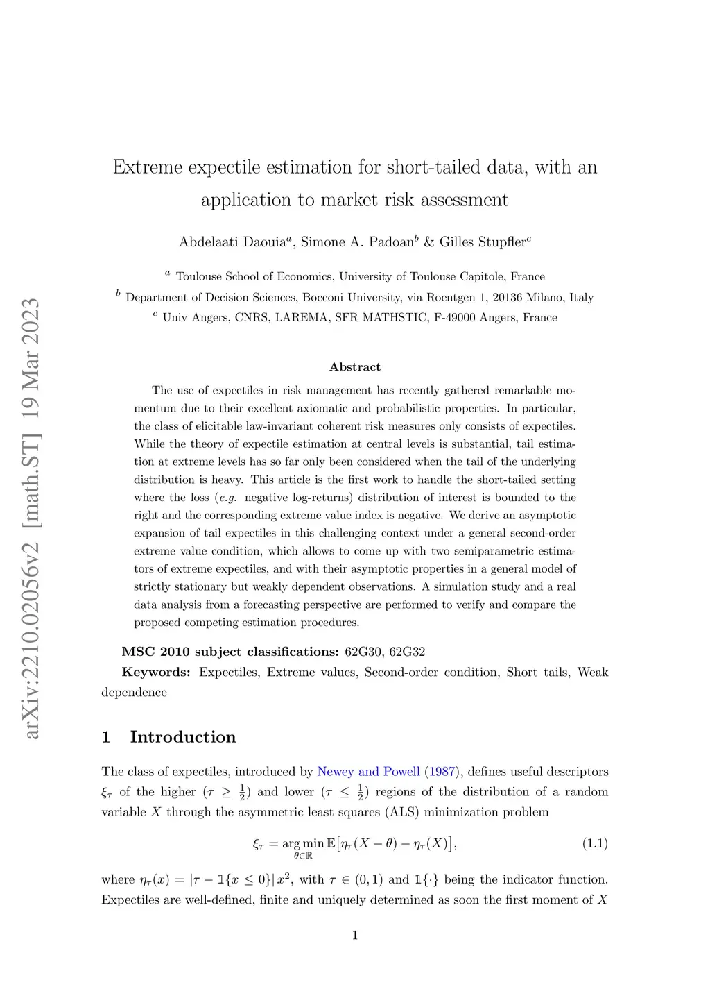 Extreme expectile estimation for short-tailed data, with an application