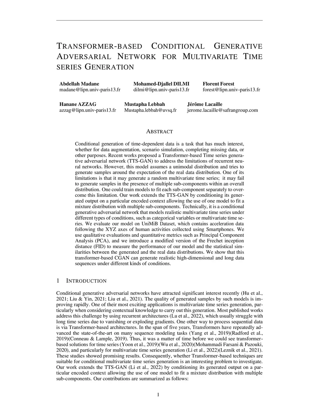 Conditional generation of time-dependent data is a task that has much interest, whether for data augmentation, scenario simulation, completing missing data, or other purposes. Recent works proposed a Transformer-based Time series generative adversarial network (TTS-GAN) to address the limitations of recurrent neural networks. However, this model assumes a unimodal distribution and tries to generate samples around the expectation of the real data distribution. One of its limitations is that it may generate a random multivariate time series; it may fail to generate samples in the presence of multiple sub-components within an overall distribution. One could train models to fit each sub-component separately to overcome this limitation. Our work extends the TTS-GAN by conditioning its generated output on a particular encoded context allowing the use of one model to fit a mixture distribution with multiple sub-components. Technically, it is a conditional generative adversarial network that models realistic multivariate time series under different types of conditions, such as categorical variables or multivariate time series. We evaluate our model on UniMiB Dataset, which contains acceleration data following the XYZ axes of human activities collected using Smartphones. We use qualitative evaluations and quantitative metrics such as Principal Component Analysis (PCA), and we introduce a modified version of the Frechet inception distance (FID) to measure the performance of our model and the statistical similarities between the generated and the real data distributions. We show that this transformer-based CGAN can generate realistic high-dimensional and long data sequences under different kinds of conditions.