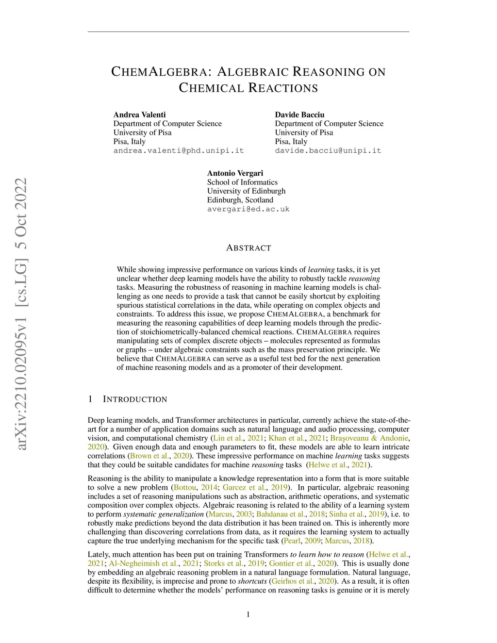 While showing impressive performance on various kinds of learning tasks, it is yet unclear whether deep learning models have the ability to robustly tackle reasoning tasks. than by learning the underlying reasoning process that is actually required to solve the tasks. Measuring the robustness of reasoning in machine learning models is challenging as one needs to provide a task that cannot be easily shortcut by exploiting spurious statistical correlations in the data, while operating on complex objects and constraints. reasoning task. To address this issue, we propose ChemAlgebra, a benchmark for measuring the reasoning capabilities of deep learning models through the prediction of stoichiometrically-balanced chemical reactions. ChemAlgebra requires manipulating sets of complex discrete objects -- molecules represented as formulas or graphs -- under algebraic constraints such as the mass preservation principle. We believe that ChemAlgebra can serve as a useful test bed for the next generation of machine reasoning models and as a promoter of their development.