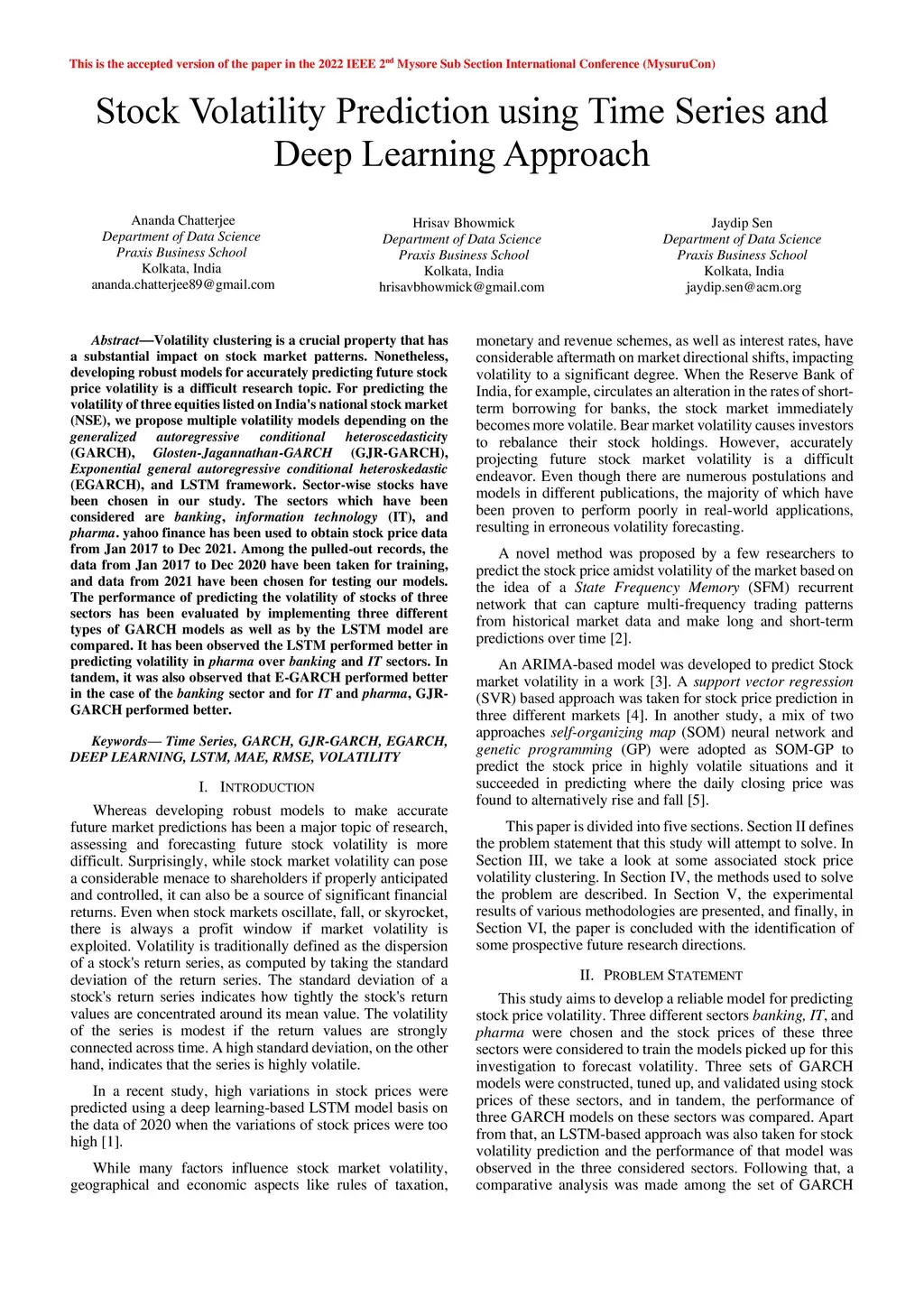 Volatility clustering is a crucial property that has a substantial impact on stock market patterns. Nonetheless, developing robust models for accurately predicting future stock price volatility is a difficult research topic. For predicting the volatility of three equities listed on India's national stock market (NSE), we propose multiple volatility models depending on the generalized autoregressive conditional heteroscedasticity (GARCH), Glosten-Jagannathan-GARCH (GJR-GARCH), Exponential general autoregressive conditional heteroskedastic (EGARCH), and LSTM framework. Sector-wise stocks have been chosen in our study. The sectors which have been considered are banking, information technology (IT), and pharma. yahoo finance has been used to obtain stock price data from Jan 2017 to Dec 2021. Among the pulled-out records, the data from Jan 2017 to Dec 2020 have been taken for training, and data from 2021 have been chosen for testing our models. The performance of predicting the volatility of stocks of three sectors has been evaluated by implementing three different types of GARCH models as well as by the LSTM model are compared. It has been observed the LSTM performed better in predicting volatility in pharma over banking and IT sectors. In tandem, it was also observed that E-GARCH performed better in the case of the banking sector and for IT and pharma, GJR-GARCH performed better.