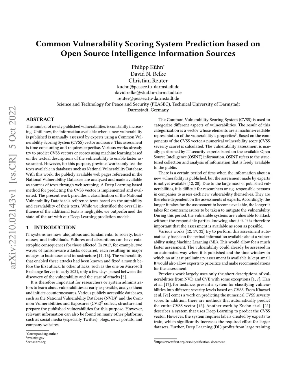 The number of newly published vulnerabilities is constantly increasing. Until now, the information available when a new vulnerability is published is manually assessed by experts using a Common Vulnerability Scoring System (CVSS) vector and score. This assessment is time consuming and requires expertise. Various works already try to predict CVSS vectors or scores using machine learning based on the textual descriptions of the vulnerability to enable faster assessment. However, for this purpose, previous works only use the texts available in databases such as National Vulnerability Database. With this work, the publicly available web pages referenced in the National Vulnerability Database are analyzed and made available as sources of texts through web scraping. A Deep Learning based method for predicting the CVSS vector is implemented and evaluated. The present work provides a classification of the National Vulnerability Database's reference texts based on the suitability and crawlability of their texts. While we identified the overall influence of the additional texts is negligible, we outperformed the state-of-the-art with our Deep Learning prediction models.