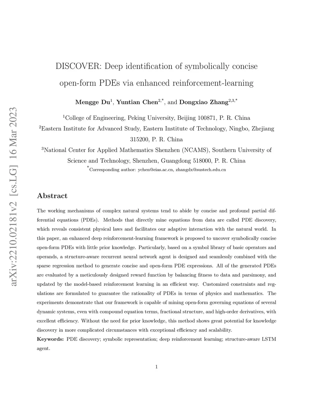 The working mechanisms of complex natural systems tend to abide by concise and profound partial differential equations (PDEs). Methods that directly mine equations from data are called PDE discovery, which reveals consistent physical laws and facilitates our adaptive interaction with the natural world. In this paper, an enhanced deep reinforcement-learning framework is proposed to uncover symbolically concise open-form PDEs with little prior knowledge. Particularly, based on a symbol library of basic operators and operands, a structure-aware recurrent neural network agent is designed and seamlessly combined with the sparse regression method to generate concise and open-form PDE expressions. All of the generated PDEs are evaluated by a meticulously designed reward function by balancing fitness to data and parsimony, and updated by the model-based reinforcement learning in an efficient way. Customized constraints and regulations are formulated to guarantee the rationality of PDEs in terms of physics and mathematics. The experiments demonstrate that our framework is capable of mining open-form governing equations of several dynamic systems, even with compound equation terms, fractional structure, and high-order derivatives, with excellent efficiency. Without the need for prior knowledge, this method shows great potential for knowledge discovery in more complicated circumstances with exceptional efficiency and scalability.