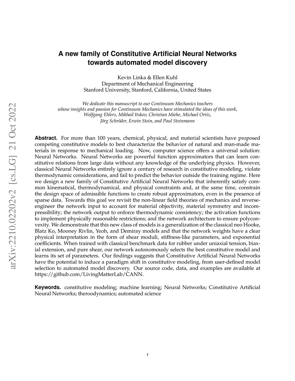 For more than 100 years, chemical, physical, and material scientists have proposed competing constitutive models to best characterize the behavior of natural and man-made materials in response to mechanical loading. Now, computer science offers a universal solution: Neural Networks. Neural Networks are powerful function approximators that can learn constitutive relations from large data without any knowledge of the underlying physics. However, classical Neural Networks ignore a century of research in constitutive modeling, violate thermodynamic considerations, and fail to predict the behavior outside the training regime. Here we design a new family of Constitutive Artificial Neural Networks that inherently satisfy common kinematic, thermodynamic, and physic constraints and, at the same time, constrain the design space of admissible functions to create robust approximators, even in the presence of sparse data. We revisit the non-linear field theories of mechanics and reverse-engineer the network input to account for material objectivity, symmetry, and incompressibility; the network output to enforce thermodynamic consistency; the activation functions to implement physically reasonable restrictions; and the network architecture to ensure polyconvexity. We demonstrate that this new class of models is a generalization of the classical neo Hooke, Blatz Ko, Mooney Rivlin, Yeoh, and Demiray models and that the network weights have a clear physical interpretation. When trained with classical benchmark data for rubber, our network autonomously selects the best constitutive model and learns its parameters. Our findings suggests that Constitutive Artificial Neural Networks have the potential to induce a paradigm shift in constitutive modeling, from user-defined model selection to automated model discovery. Our source code, data, and examples are available at https://github.com/LivingMatterLab/CANN.