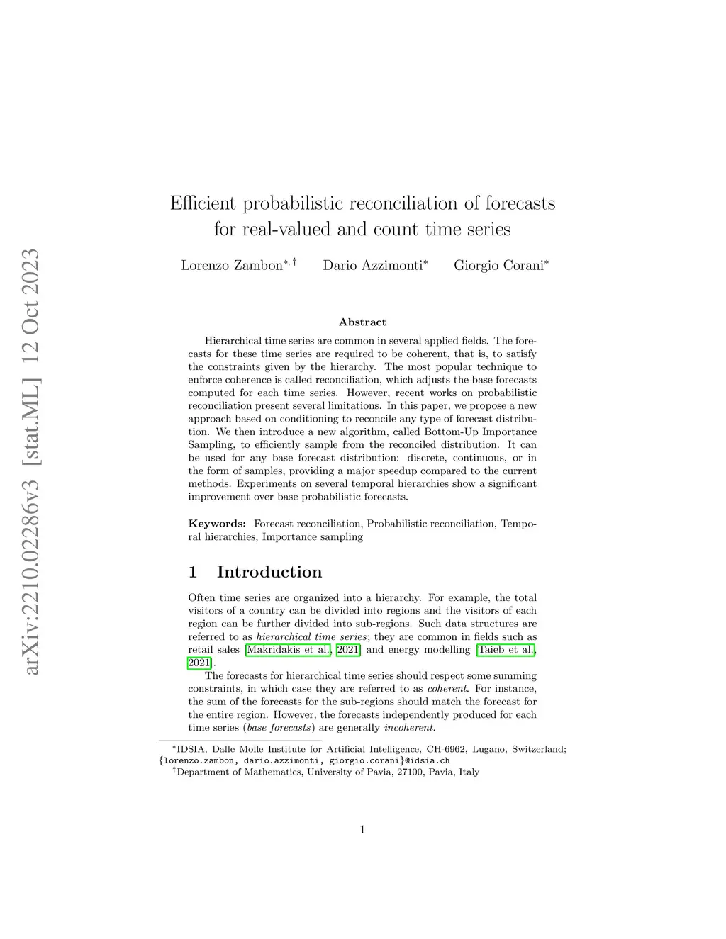 Hierarchical time series are common in several applied fields. The forecasts for these time series are required to be coherent, that is, to satisfy the constraints given by the hierarchy. The most popular technique to enforce coherence is called reconciliation, which adjusts the base forecasts computed for each time series. However, recent works on probabilistic reconciliation present several limitations. In this paper, we propose a new approach based on conditioning to reconcile any type of forecast distribution. We then introduce a new algorithm, called Bottom-Up Importance Sampling, to efficiently sample from the reconciled distribution. It can be used for any base forecast distribution: discrete, continuous, or in the form of samples, providing a major speedup compared to the current methods. Experiments on several temporal hierarchies show a significant improvement over base probabilistic forecasts.