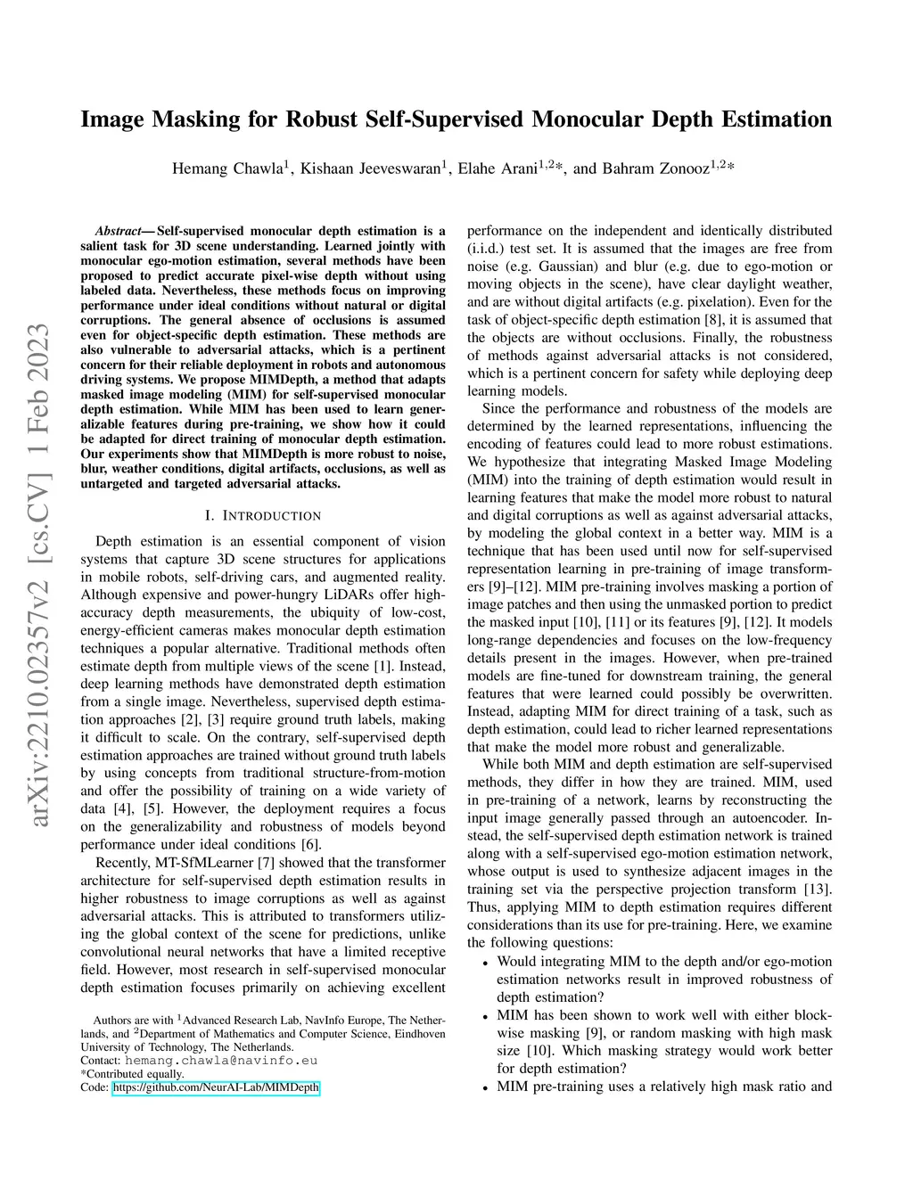 Self-supervised monocular depth estimation is a salient task for 3D scene understanding. Learned jointly with monocular ego-motion estimation, several methods have been proposed to predict accurate pixel-wise depth without using labeled data. Nevertheless, these methods focus on improving performance under ideal conditions without natural or digital corruptions. The general absence of occlusions is assumed even for object-specific depth estimation. These methods are also vulnerable to adversarial attacks, which is a pertinent concern for their reliable deployment in robots and autonomous driving systems. We propose MIMDepth, a method that adapts masked image modeling (MIM) for self-supervised monocular depth estimation. While MIM has been used to learn generalizable features during pre-training, we show how it could be adapted for direct training of monocular depth estimation. Our experiments show that MIMDepth is more robust to noise, blur, weather conditions, digital artifacts, occlusions, as well as untargeted and targeted adversarial attacks.