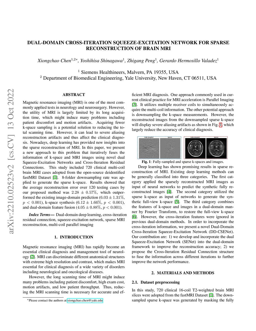 Magnetic resonance imaging (MRI) is one of the most commonly applied tests in neurology and neurosurgery. However, the utility of MRI is largely limited by its long acquisition time, which might induce many problems including patient discomfort and motion artifacts. Acquiring fewer k-space sampling is a potential solution to reducing the total scanning time. However, it can lead to severe aliasing reconstruction artifacts and thus affect the clinical diagnosis. Nowadays, deep learning has provided new insights into the sparse reconstruction of MRI. In this paper, we present a new approach to this problem that iteratively fuses the information of k-space and MRI images using novel dual Squeeze-Excitation Networks and Cross-Iteration Residual Connections. This study included 720 clinical multi-coil brain MRI cases adopted from the open-source deidentified fastMRI Dataset. 8-folder downsampling rate was applied to generate the sparse k-space. Results showed that the average reconstruction error over 120 testing cases by our proposed method was 2.28%, which outperformed the existing image-domain prediction (6.03%, p<0.001), k-space synthesis (6.12%, p<0.001), and dual-domain feature fusion (4.05%, p<0.001).