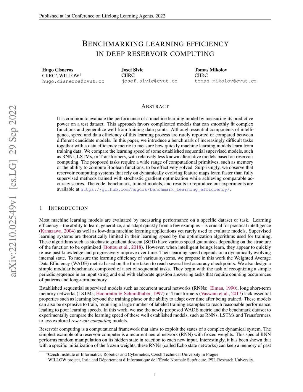 It is common to evaluate the performance of a machine learning model by measuring its predictive power on a test dataset. This approach favors complicated models that can smoothly fit complex functions and generalize well from training data points. Although essential components of intelligence, speed and data efficiency of this learning process are rarely reported or compared between different candidate models. In this paper, we introduce a benchmark of increasingly difficult tasks together with a data efficiency metric to measure how quickly machine learning models learn from training data. We compare the learning speed of some established sequential supervised models, such as RNNs, LSTMs, or Transformers, with relatively less known alternative models based on reservoir computing. The proposed tasks require a wide range of computational primitives, such as memory or the ability to compute Boolean functions, to be effectively solved. Surprisingly, we observe that reservoir computing systems that rely on dynamically evolving feature maps learn faster than fully supervised methods trained with stochastic gradient optimization while achieving comparable accuracy scores. The code, benchmark, trained models, and results to reproduce our experiments are available at https://github.com/hugcis/benchmark_learning_efficiency/ .