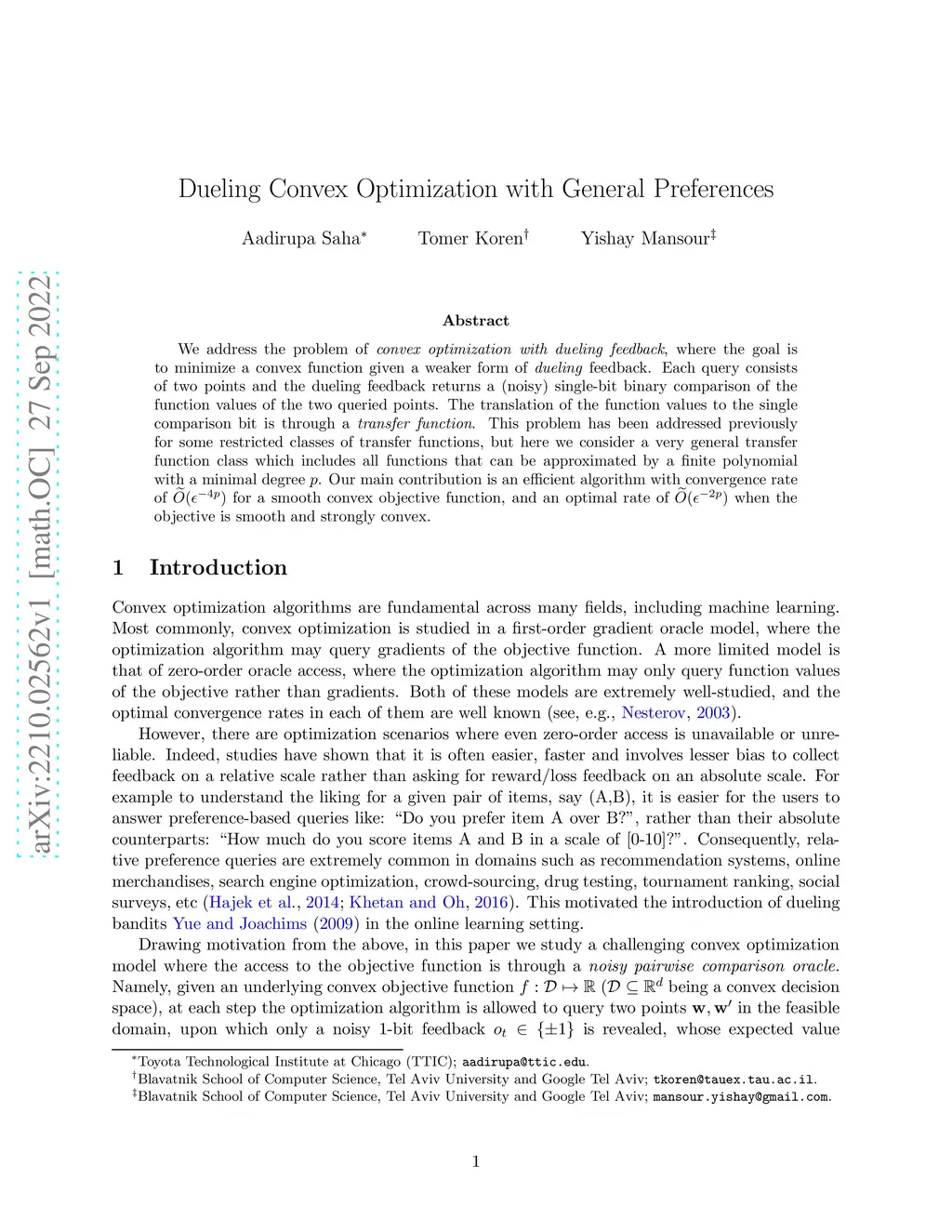 We address the problem of \emph{convex optimization with dueling feedback}, where the goal is to minimize a convex function given a weaker form of \emph{dueling} feedback. Each query consists of two points and the dueling feedback returns a (noisy) single-bit binary comparison of the function values of the two queried points. The translation of the function values to the single comparison bit is through a \emph{transfer function}. This problem has been addressed previously for some restricted classes of transfer functions, but here we consider a very general transfer function class which includes all functions that can be approximated by a finite polynomial with a minimal degree . Our main contribution is an efficient algorithm with convergence rate of for a smooth convex objective function, and an optimal rate of when the objective is smooth and strongly convex.