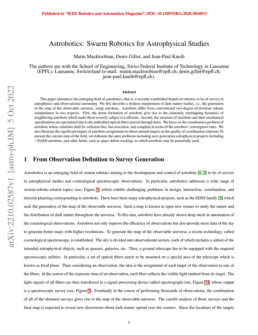 This paper introduces the emerging field of astrobotics, that is, a recently-established branch of robotics to be of service to astrophysics and observational astronomy. We first describe a modern requirement of dark matter studies, i.e., the generation of the map of the observable universe, using astrobots. Astrobots differ from conventional two-degree-of-freedom robotic manipulators in two respects. First, the dense formation of astrobots give rise to the extremely overlapping dynamics of neighboring astrobots which make them severely subject to collisions. Second, the structure of astrobots and their mechanical specifications are specialized due to the embedded optical fibers passed through them. We focus on the coordination problem of astrobots whose solutions shall be collision-free, fast execution, and complete in terms of the astrobots' convergence rates. We also illustrate the significant impact of astrobots assignments to observational targets on the quality of coordination solutions To present the current state of the field, we elaborate the open problems including next-generation astrophysical projects including 20,000 astrobots, and other fields, such as space debris tracking, in which astrobots may be potentially used