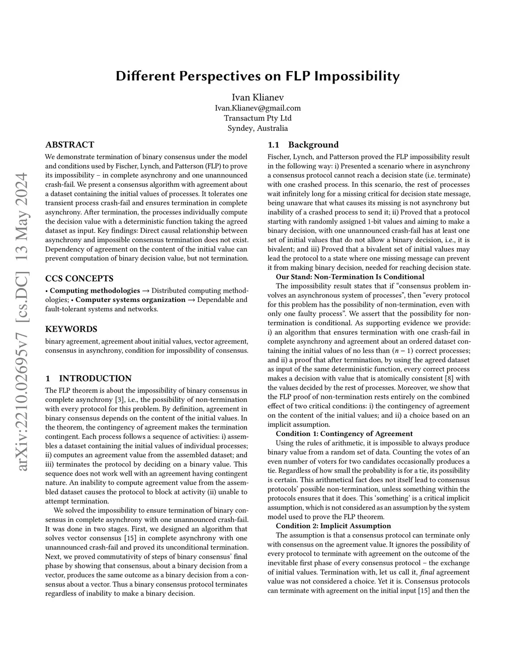We demonstrate termination of binary consensus under the model and conditions used by Fischer, Lynch, and Patterson (FLP) to prove its impossibility - in complete asynchrony and one unannounced crash-fail. We present a consensus algorithm with agreement about a dataset containing the initial values of processes. It tolerates one transient process crash-fail and ensures termination in complete asynchrony. After termination, the processes individually compute the decision value with a deterministic function taking the agreed dataset as input. Key findings: Direct causal relationship between asynchrony and impossible consensus termination does not exist. Dependency of agreement on the content of the initial value can prevent computation of binary decision value, but not termination.