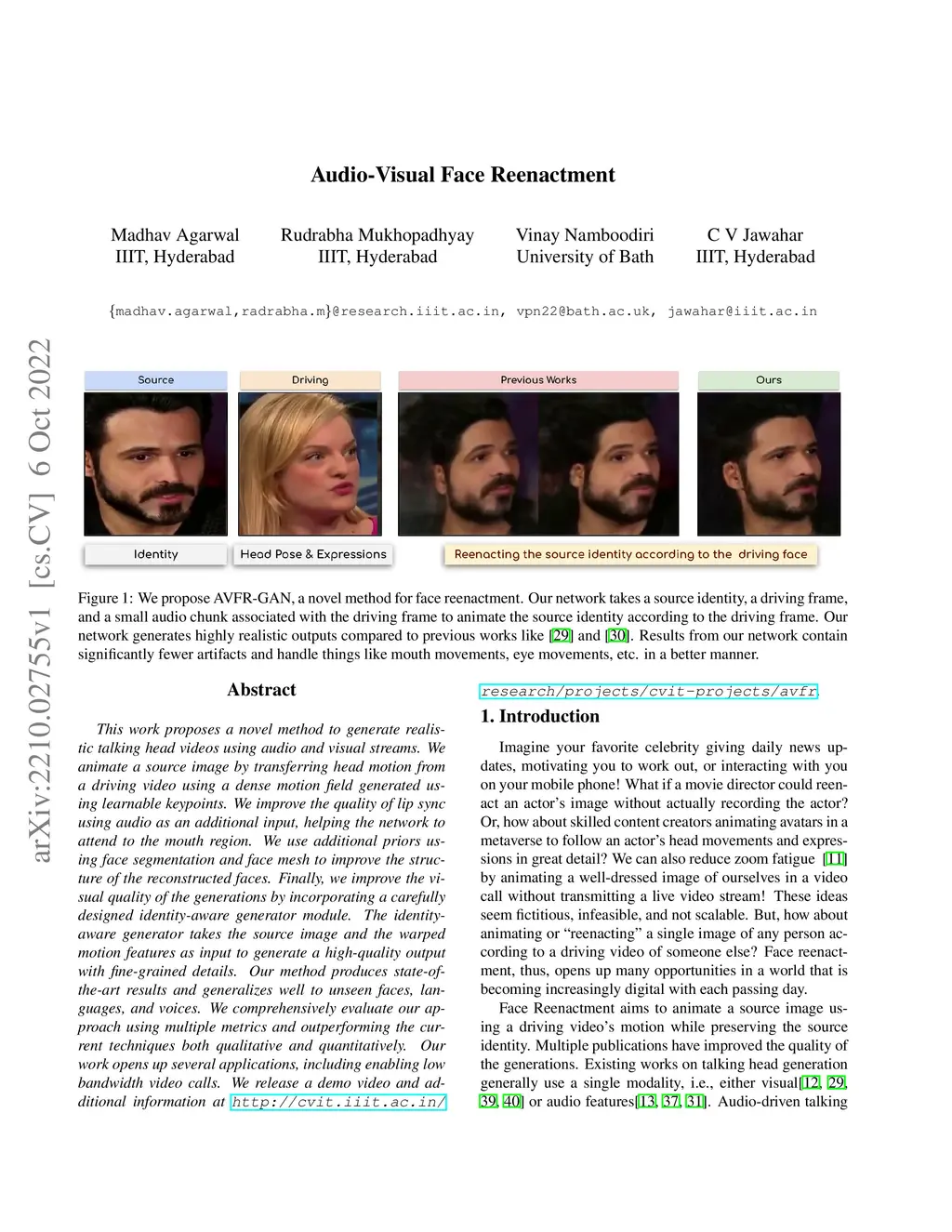 This work proposes a novel method to generate realistic talking head videos using audio and visual streams. We animate a source image by transferring head motion from a driving video using a dense motion field generated using learnable keypoints. We improve the quality of lip sync using audio as an additional input, helping the network to attend to the mouth region. We use additional priors using face segmentation and face mesh to improve the structure of the reconstructed faces. Finally, we improve the visual quality of the generations by incorporating a carefully designed identity-aware generator module. The identity-aware generator takes the source image and the warped motion features as input to generate a high-quality output with fine-grained details. Our method produces state-of-the-art results and generalizes well to unseen faces, languages, and voices. We comprehensively evaluate our approach using multiple metrics and outperforming the current techniques both qualitative and quantitatively. Our work opens up several applications, including enabling low bandwidth video calls. We release a demo video and additional information at http://cvit.iiit.ac.in/research/projects/cvit-projects/avfr.