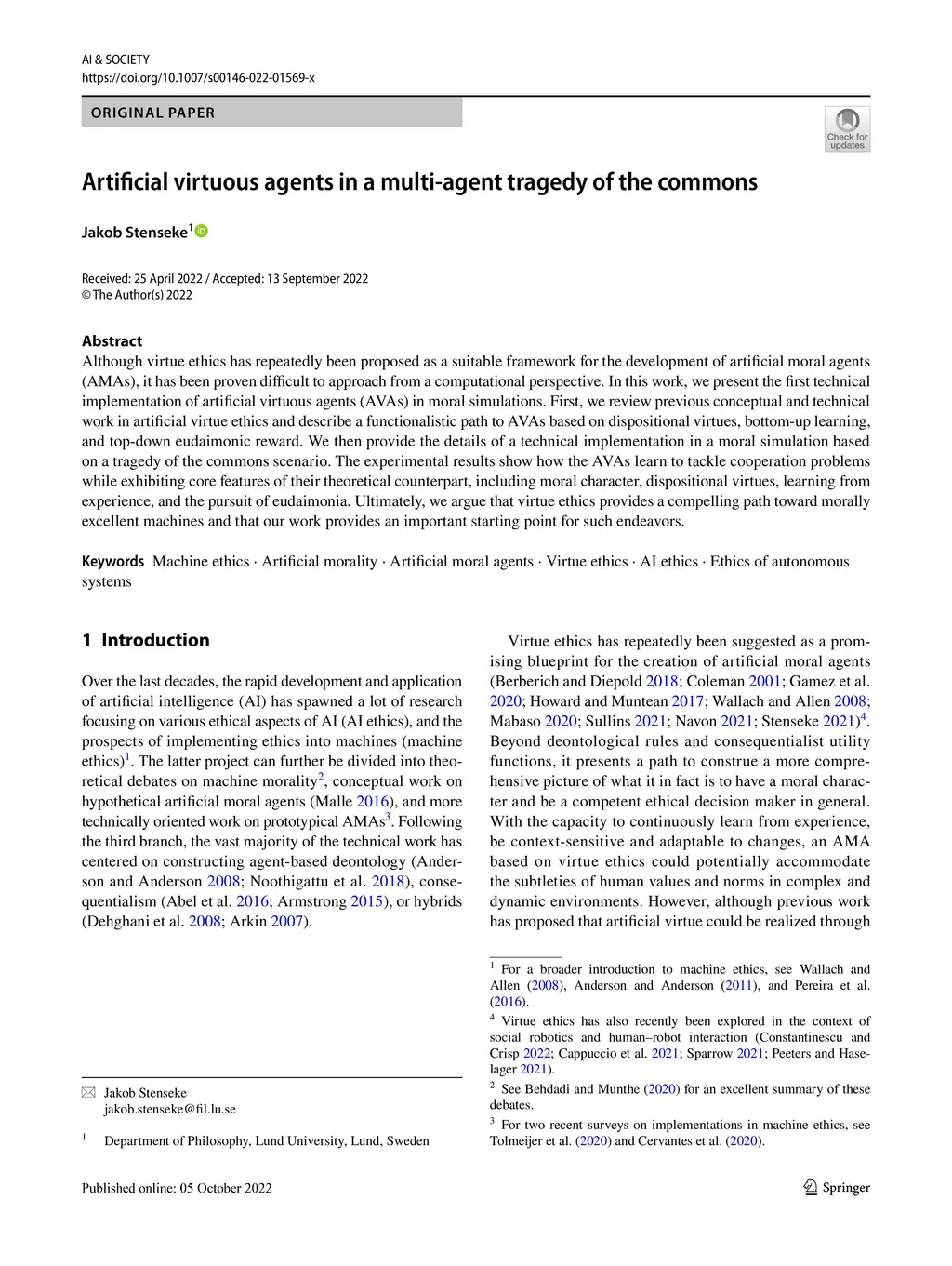 Artificial virtuous agents in a multiagent tragedy of the commons