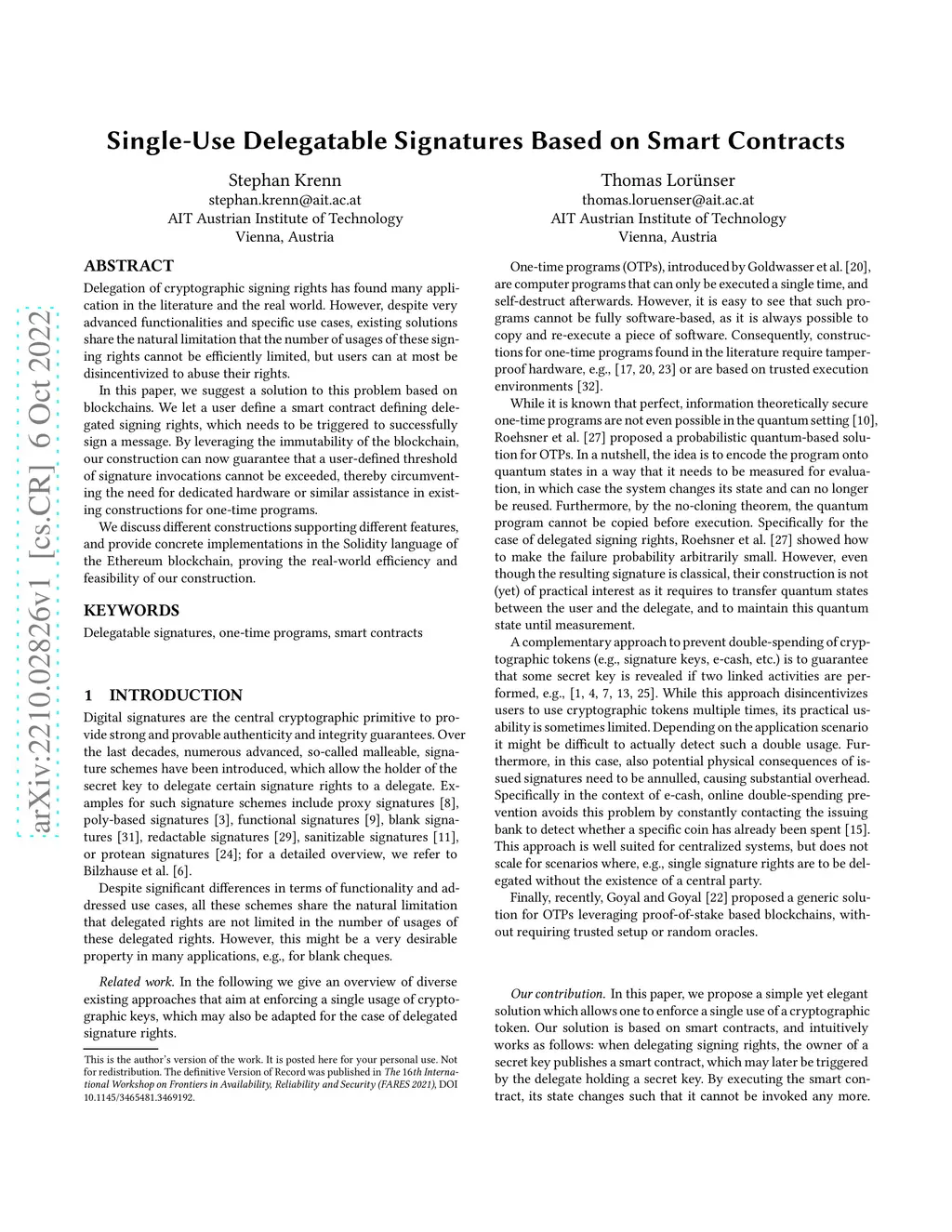 Single-Use Delegatable Signatures Based on Smart Contracts