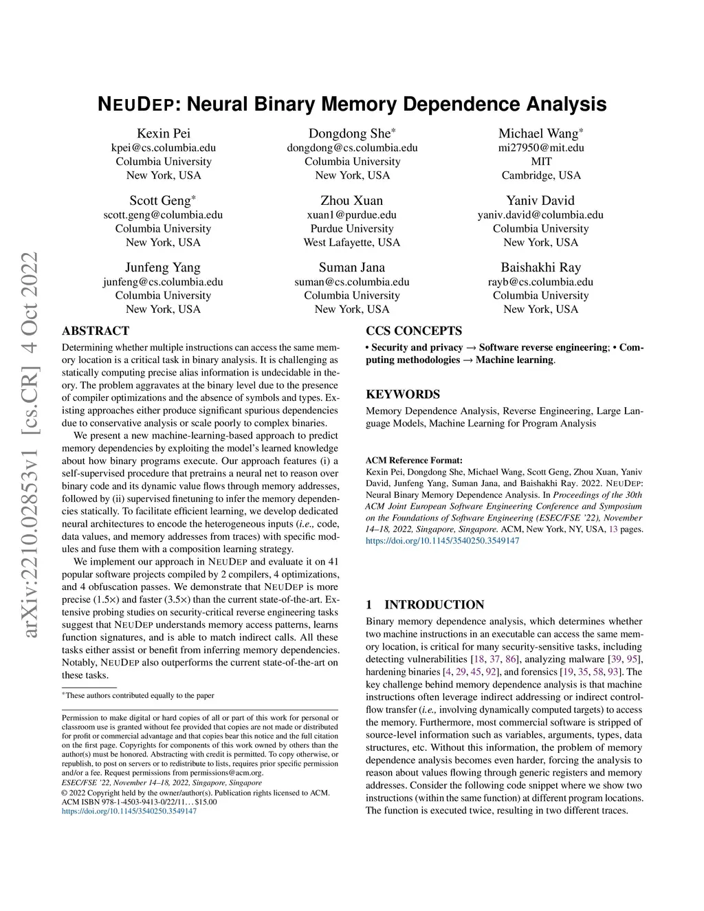 Determining whether multiple instructions can access the same memory location is a critical task in binary analysis. It is challenging as statically computing precise alias information is undecidable in theory. The problem aggravates at the binary level due to the presence of compiler optimizations and the absence of symbols and types. Existing approaches either produce significant spurious dependencies due to conservative analysis or scale poorly to complex binaries. We present a new machine-learning-based approach to predict memory dependencies by exploiting the model's learned knowledge about how binary programs execute. Our approach features (i) a self-supervised procedure that pretrains a neural net to reason over binary code and its dynamic value flows through memory addresses, followed by (ii) supervised finetuning to infer the memory dependencies statically. To facilitate efficient learning, we develop dedicated neural architectures to encode the heterogeneous inputs (i.e., code, data values, and memory addresses from traces) with specific modules and fuse them with a composition learning strategy. We implement our approach in NeuDep and evaluate it on 41 popular software projects compiled by 2 compilers, 4 optimizations, and 4 obfuscation passes. We demonstrate that NeuDep is more precise (1.5x) and faster (3.5x) than the current state-of-the-art. Extensive probing studies on security-critical reverse engineering tasks suggest that NeuDep understands memory access patterns, learns function signatures, and is able to match indirect calls. All these tasks either assist or benefit from inferring memory dependencies. Notably, NeuDep also outperforms the current state-of-the-art on these tasks.
