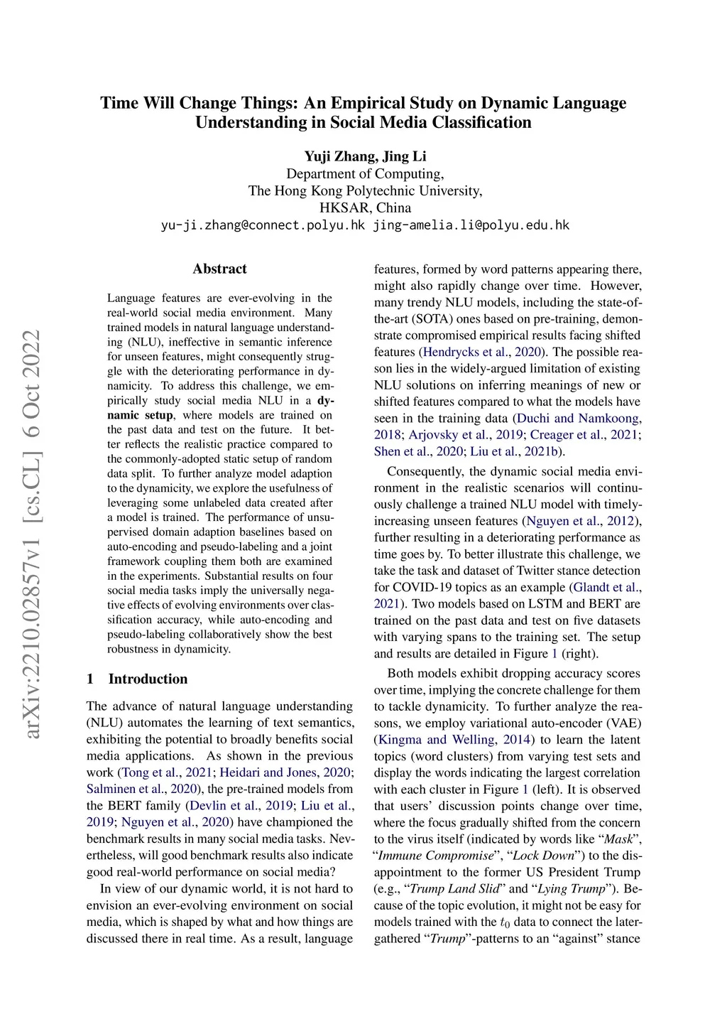 Language features are ever-evolving in the real-world social media environment. Many trained models in natural language understanding (NLU), ineffective in semantic inference for unseen features, might consequently struggle with the deteriorating performance in dynamicity. To address this challenge, we empirically study social media NLU in a dynamic setup, where models are trained on the past data and test on the future. It better reflects the realistic practice compared to the commonly-adopted static setup of random data split. To further analyze model adaption to the dynamicity, we explore the usefulness of leveraging some unlabeled data created after a model is trained. The performance of unsupervised domain adaption baselines based on auto-encoding and pseudo-labeling and a joint framework coupling them both are examined in the experiments. Substantial results on four social media tasks imply the universally negative effects of evolving environments over classification accuracy, while auto-encoding and pseudo-labeling collaboratively show the best robustness in dynamicity.