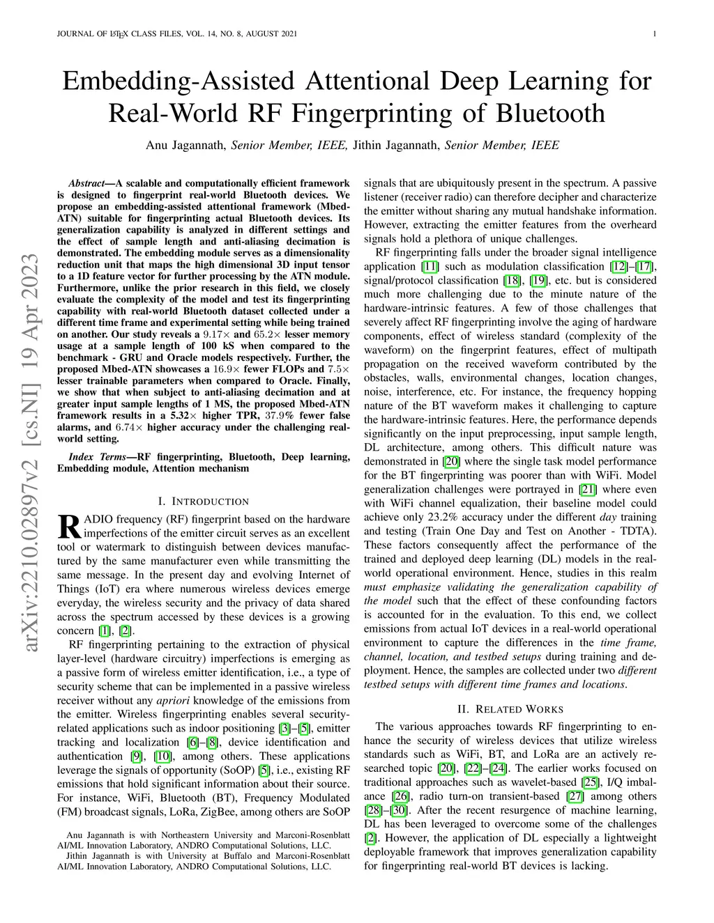 A scalable and computationally efficient framework is designed to fingerprint real-world Bluetooth devices. We propose an embedding-assisted attentional framework (Mbed-ATN) suitable for fingerprinting actual Bluetooth devices. Its generalization capability is analyzed in different settings and the effect of sample length and anti-aliasing decimation is demonstrated. The embedding module serves as a dimensionality reduction unit that maps the high dimensional 3D input tensor to a 1D feature vector for further processing by the ATN module. Furthermore, unlike the prior research in this field, we closely evaluate the complexity of the model and test its fingerprinting capability with real-world Bluetooth dataset collected under a different time frame and experimental setting while being trained on another. Our study reveals a 9.17x and 65.2x lesser memory usage at a sample length of 100 kS when compared to the benchmark - GRU and Oracle models respectively. Further, the proposed Mbed-ATN showcases 16.9x fewer FLOPs and 7.5x lesser trainable parameters when compared to Oracle. Finally, we show that when subject to anti-aliasing decimation and at greater input sample lengths of 1 MS, the proposed Mbed-ATN framework results in a 5.32x higher TPR, 37.9% fewer false alarms, and 6.74x higher accuracy under the challenging real-world setting.