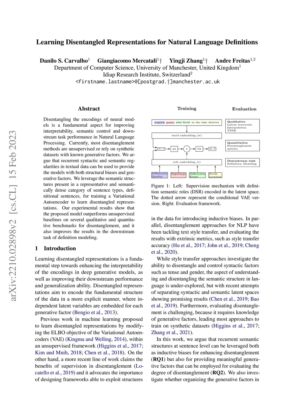 Disentangling the encodings of neural models is a fundamental aspect for improving interpretability, semantic control and downstream task performance in Natural Language Processing. Currently, most disentanglement methods are unsupervised or rely on synthetic datasets with known generative factors. We argue that recurrent syntactic and semantic regularities in textual data can be used to provide the models with both structural biases and generative factors. We leverage the semantic structures present in a representative and semantically dense category of sentence types, definitional sentences, for training a Variational Autoencoder to learn disentangled representations. Our experimental results show that the proposed model outperforms unsupervised baselines on several qualitative and quantitative benchmarks for disentanglement, and it also improves the results in the downstream task of definition modeling.