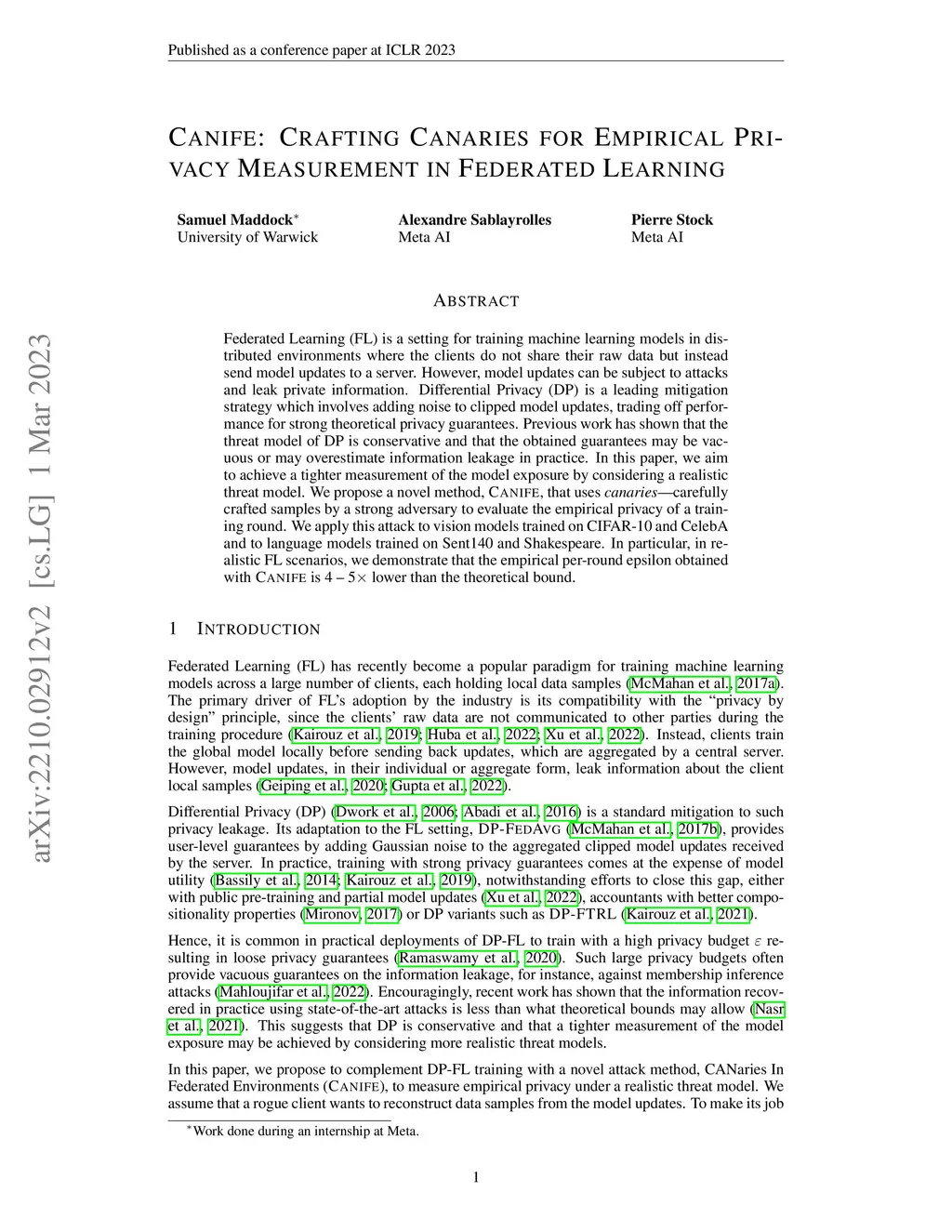 Federated Learning (FL) is a setting for training machine learning models in distributed environments where the clients do not share their raw data but instead send model updates to a server. However, model updates can be subject to attacks and leak private information. Differential Privacy (DP) is a leading mitigation strategy which involves adding noise to clipped model updates, trading off performance for strong theoretical privacy guarantees. Previous work has shown that the threat model of DP is conservative and that the obtained guarantees may be vacuous or may overestimate information leakage in practice. In this paper, we aim to achieve a tighter measurement of the model exposure by considering a realistic threat model. We propose a novel method, CANIFE, that uses canaries - carefully crafted samples by a strong adversary to evaluate the empirical privacy of a training round. We apply this attack to vision models trained on CIFAR-10 and CelebA and to language models trained on Sent140 and Shakespeare. In particular, in realistic FL scenarios, we demonstrate that the empirical per-round epsilon obtained with CANIFE is 4-5x lower than the theoretical bound.