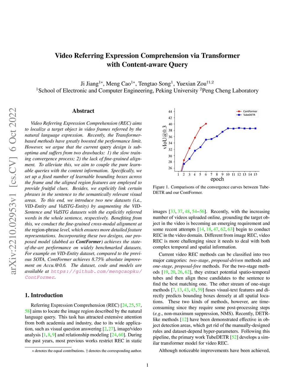 Video Referring Expression Comprehension (REC) aims to localize a target object in video frames referred by the natural language expression. Recently, the Transformerbased methods have greatly boosted the performance limit. However, we argue that the current query design is suboptima and suffers from two drawbacks: 1) the slow training convergence process; 2) the lack of fine-grained alignment. To alleviate this, we aim to couple the pure learnable queries with the content information. Specifically, we set up a fixed number of learnable bounding boxes across the frame and the aligned region features are employed to provide fruitful clues. Besides, we explicitly link certain phrases in the sentence to the semantically relevant visual areas. To this end, we introduce two new datasets (i.e., VID-Entity and VidSTG-Entity) by augmenting the VIDSentence and VidSTG datasets with the explicitly referred words in the whole sentence, respectively. Benefiting from this, we conduct the fine-grained cross-modal alignment at the region-phrase level, which ensures more detailed feature representations. Incorporating these two designs, our proposed model (dubbed as ContFormer) achieves the state-of-the-art performance on widely benchmarked datasets. For example on VID-Entity dataset, compared to the previous SOTA, ContFormer achieves 8.75% absolute improvement on Accu.@0.6.