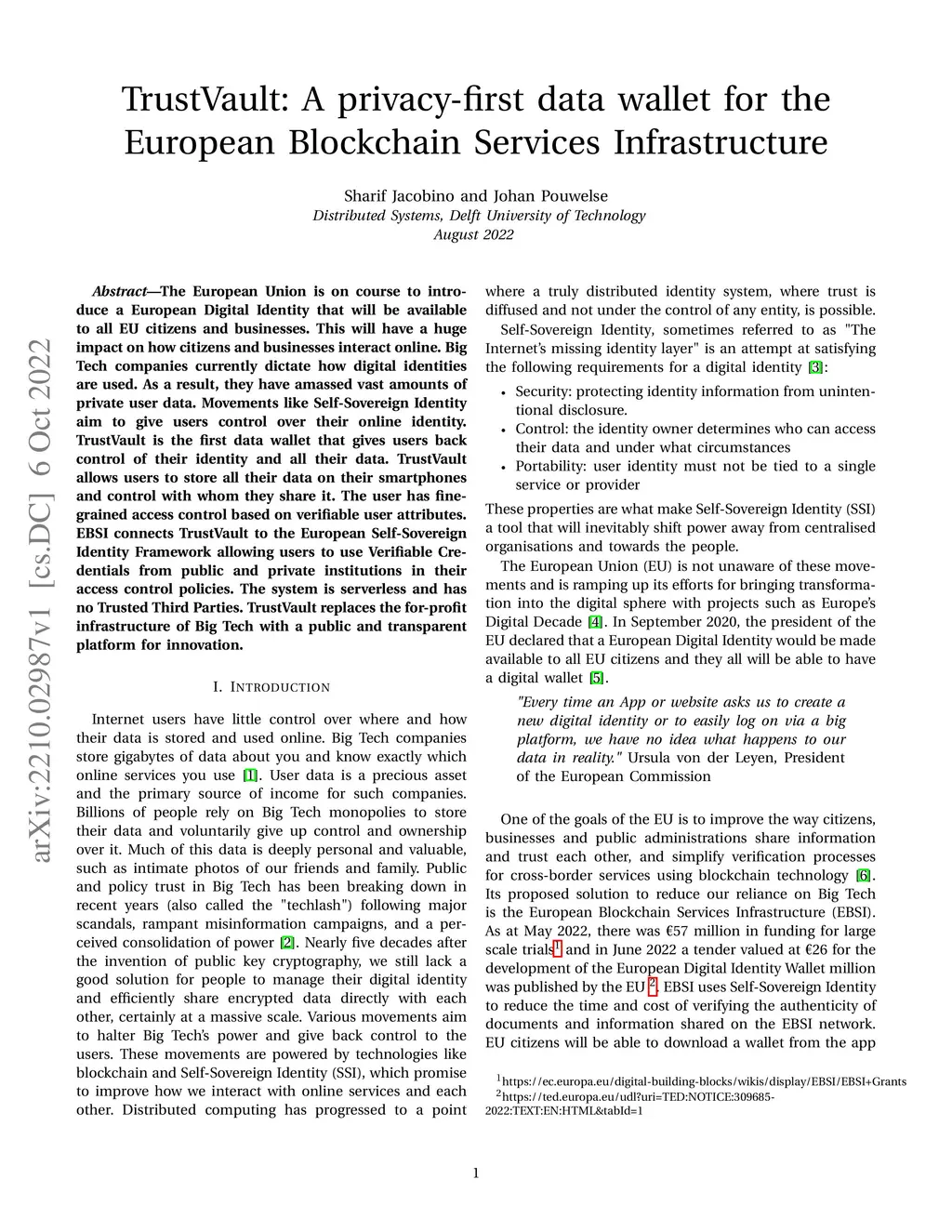 The European Union is on course to introduce a European Digital Identity that will be available to all EU citizens and businesses. This will have a huge impact on how citizens and businesses interact online. Big Tech companies currently dictate how digital identities are used. As a result, they have amassed vast amounts of private user data. Movements like Self-Sovereign Identity aim to give users control over their online identity. TrustVault is the first data wallet that gives users back control of their identity and all their data. TrustVault allows users to store all their data on their smartphones and control with whom they share it. The user has fine-grained access control based on verifiable user attributes. EBSI connects TrustVault to the European Self-Sovereign Identity Framework allowing users to use Verifiable Credentials from public and private institutions in their access control policies. The system is serverless and has no Trusted Third Parties. TrustVault replaces the for-profit infrastructure of Big Tech with a public and transparent platform for innovation.
