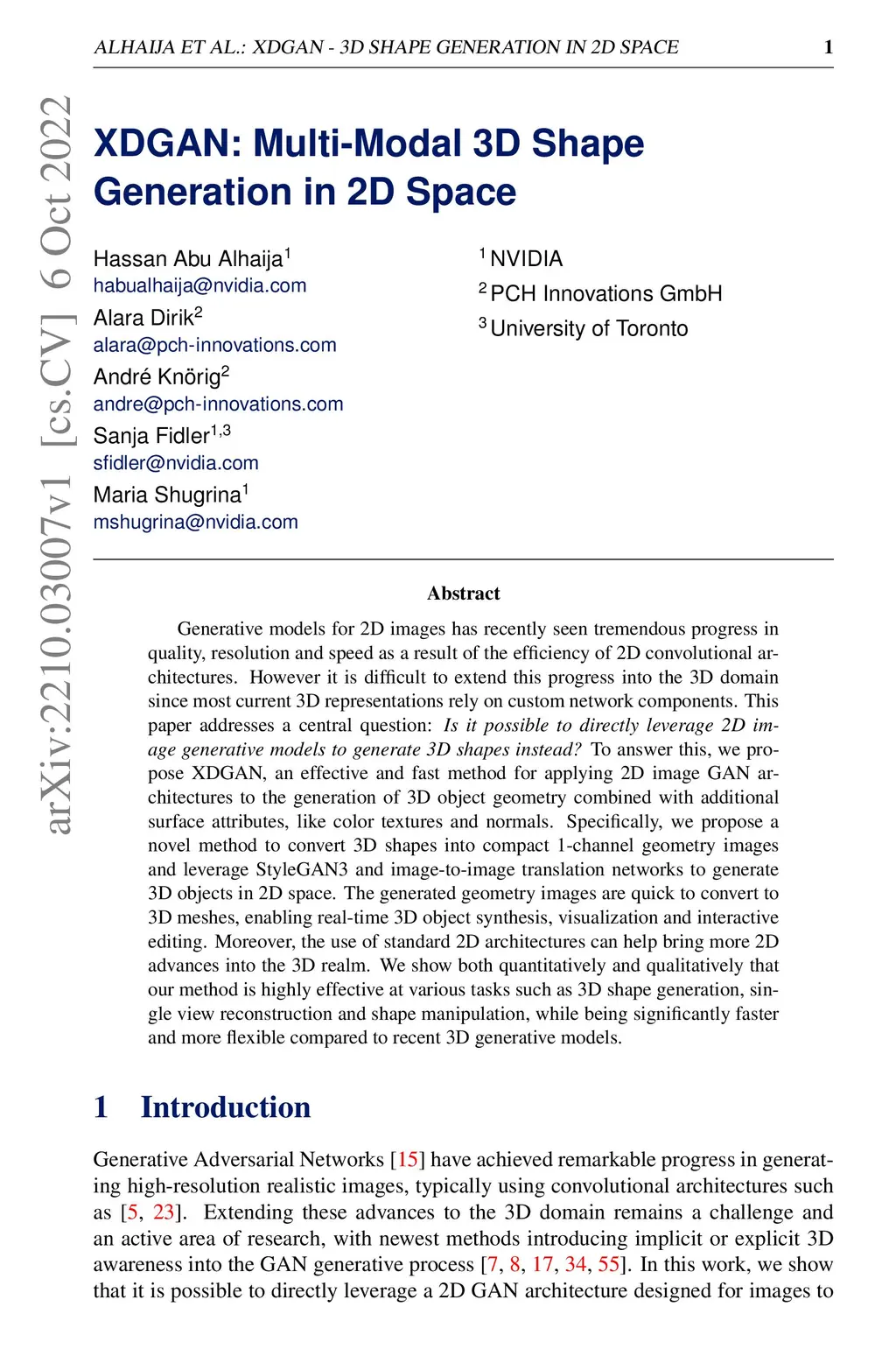 Generative models for 2D images has recently seen tremendous progress in quality, resolution and speed as a result of the efficiency of 2D convolutional architectures. However it is difficult to extend this progress into the 3D domain since most current 3D representations rely on custom network components. This paper addresses a central question: Is it possible to directly leverage 2D image generative models to generate 3D shapes instead? To answer this, we propose XDGAN, an effective and fast method for applying 2D image GAN architectures to the generation of 3D object geometry combined with additional surface attributes, like color textures and normals. Specifically, we propose a novel method to convert 3D shapes into compact 1-channel geometry images and leverage StyleGAN3 and image-to-image translation networks to generate 3D objects in 2D space. The generated geometry images are quick to convert to 3D meshes, enabling real-time 3D object synthesis, visualization and interactive editing. Moreover, the use of standard 2D architectures can help bring more 2D advances into the 3D realm. We show both quantitatively and qualitatively that our method is highly effective at various tasks such as 3D shape generation, single view reconstruction and shape manipulation, while being significantly faster and more flexible compared to recent 3D generative models.