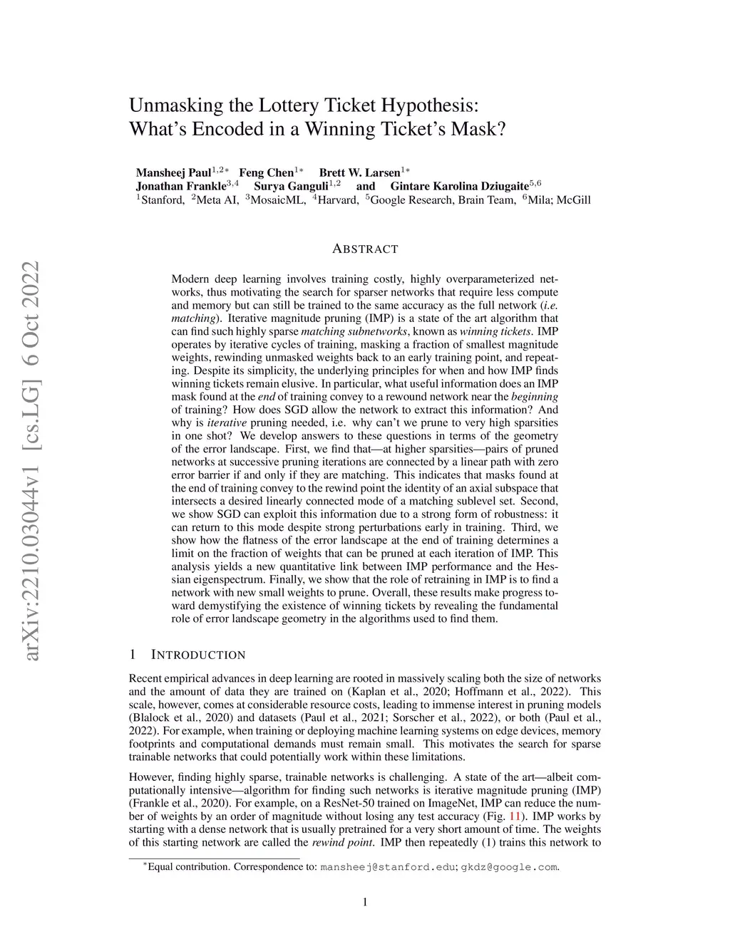 Modern deep learning involves training costly, highly overparameterized networks, thus motivating the search for sparser networks that can still be trained to the same accuracy as the full network (i.e. matching). Iterative magnitude pruning (IMP) is a state of the art algorithm that can find such highly sparse matching subnetworks, known as winning tickets. IMP operates by iterative cycles of training, masking smallest magnitude weights, rewinding back to an early training point, and repeating. Despite its simplicity, the underlying principles for when and how IMP finds winning tickets remain elusive. In particular, what useful information does an IMP mask found at the end of training convey to a rewound network near the beginning of training? How does SGD allow the network to extract this information? And why is iterative pruning needed? We develop answers in terms of the geometry of the error landscape. First, we find thatat higher sparsitiespairs of pruned networks at successive pruning iterations are connected by a linear path with zero error barrier if and only if they are matching. This indicates that masks found at the end of training convey the identity of an axial subspace that intersects a desired linearly connected mode of a matching sublevel set. Second, we show SGD can exploit this information due to a strong form of robustness: it can return to this mode despite strong perturbations early in training. Third, we show how the flatness of the error landscape at the end of training determines a limit on the fraction of weights that can be pruned at each iteration of IMP. Finally, we show that the role of retraining in IMP is to find a network with new small weights to prune. Overall, these results make progress toward demystifying the existence of winning tickets by revealing the fundamental role of error landscape geometry.