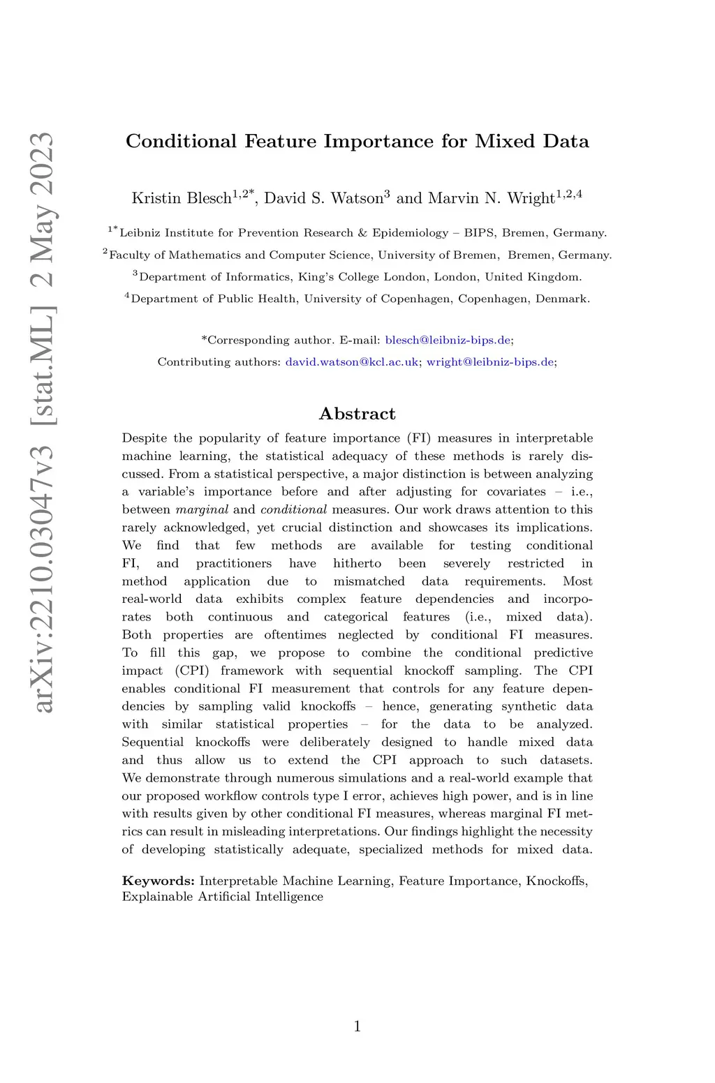 Despite the popularity of feature importance (FI) measures in interpretable machine learning, the statistical adequacy of these methods is rarely discussed. From a statistical perspective, a major distinction is between analyzing a variable's importance before and after adjusting for covariates - i.e., between and measures. Our work draws attention to this rarely acknowledged, yet crucial distinction and showcases its implications. Further, we reveal that for testing conditional FI, only few methods are available and practitioners have hitherto been severely restricted in method application due to mismatching data requirements. Most real-world data exhibits complex feature dependencies and incorporates both continuous and categorical data (mixed data). Both properties are oftentimes neglected by conditional FI measures. To fill this gap, we propose to combine the conditional predictive impact (CPI) framework with sequential knockoff sampling. The CPI enables conditional FI measurement that controls for any feature dependencies by sampling valid knockoffs - hence, generating synthetic data with similar statistical properties - for the data to be analyzed. Sequential knockoffs were deliberately designed to handle mixed data and thus allow us to extend the CPI approach to such datasets. We demonstrate through numerous simulations and a real-world example that our proposed workflow controls type I error, achieves high power and is in line with results given by other conditional FI measures, whereas marginal FI metrics result in misleading interpretations. Our findings highlight the necessity of developing statistically adequate, specialized methods for mixed data.