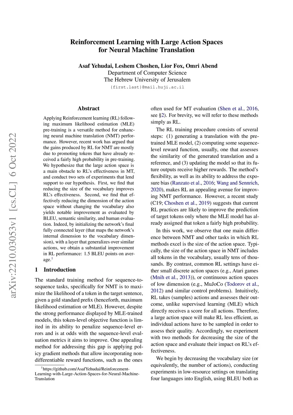 Reinforcement Learning with Large Action Spaces for Neural Machine