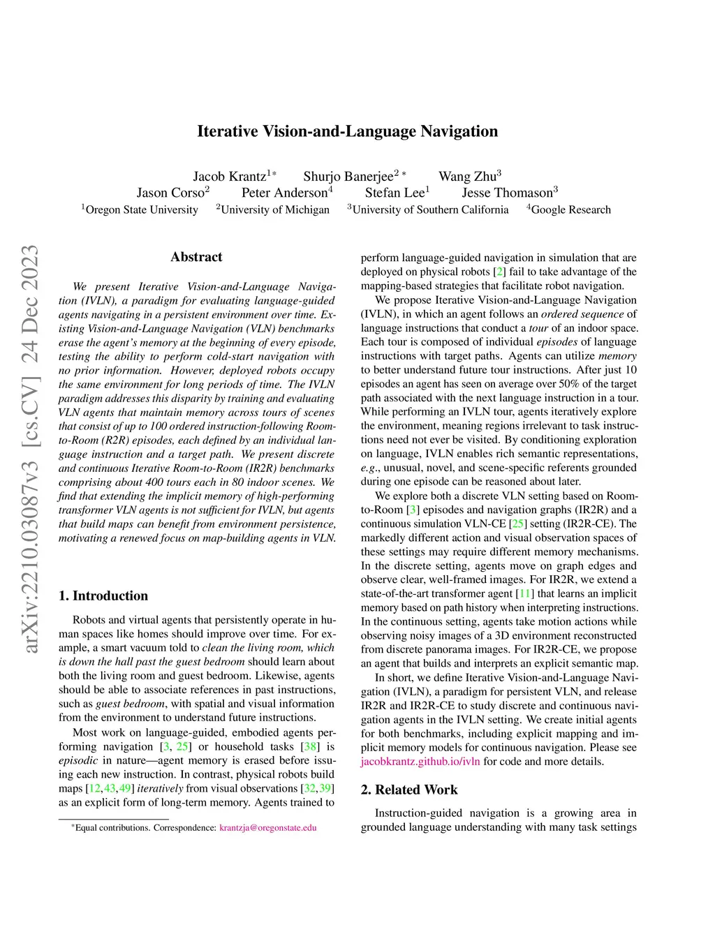 We present Iterative Vision-and-Language Navigation (IVLN), a paradigm for evaluating language-guided agents navigating in a persistent environment over time. Existing Vision-and-Language Navigation (VLN) benchmarks erase the agent's memory at the beginning of every episode, testing the ability to perform cold-start navigation with no prior information. However, deployed robots occupy the same environment for long periods of time. The IVLN paradigm addresses this disparity by training and evaluating VLN agents that maintain memory across tours of scenes that consist of up to 100 ordered instruction-following Room-to-Room (R2R) episodes, each defined by an individual language instruction and a target path. We present discrete and continuous Iterative Room-to-Room (IR2R) benchmarks comprising about 400 tours each in 80 indoor scenes. We find that extending the implicit memory of high-performing transformer VLN agents is not sufficient for IVLN, but agents that build maps can benefit from environment persistence, motivating a renewed focus on map-building agents in VLN.