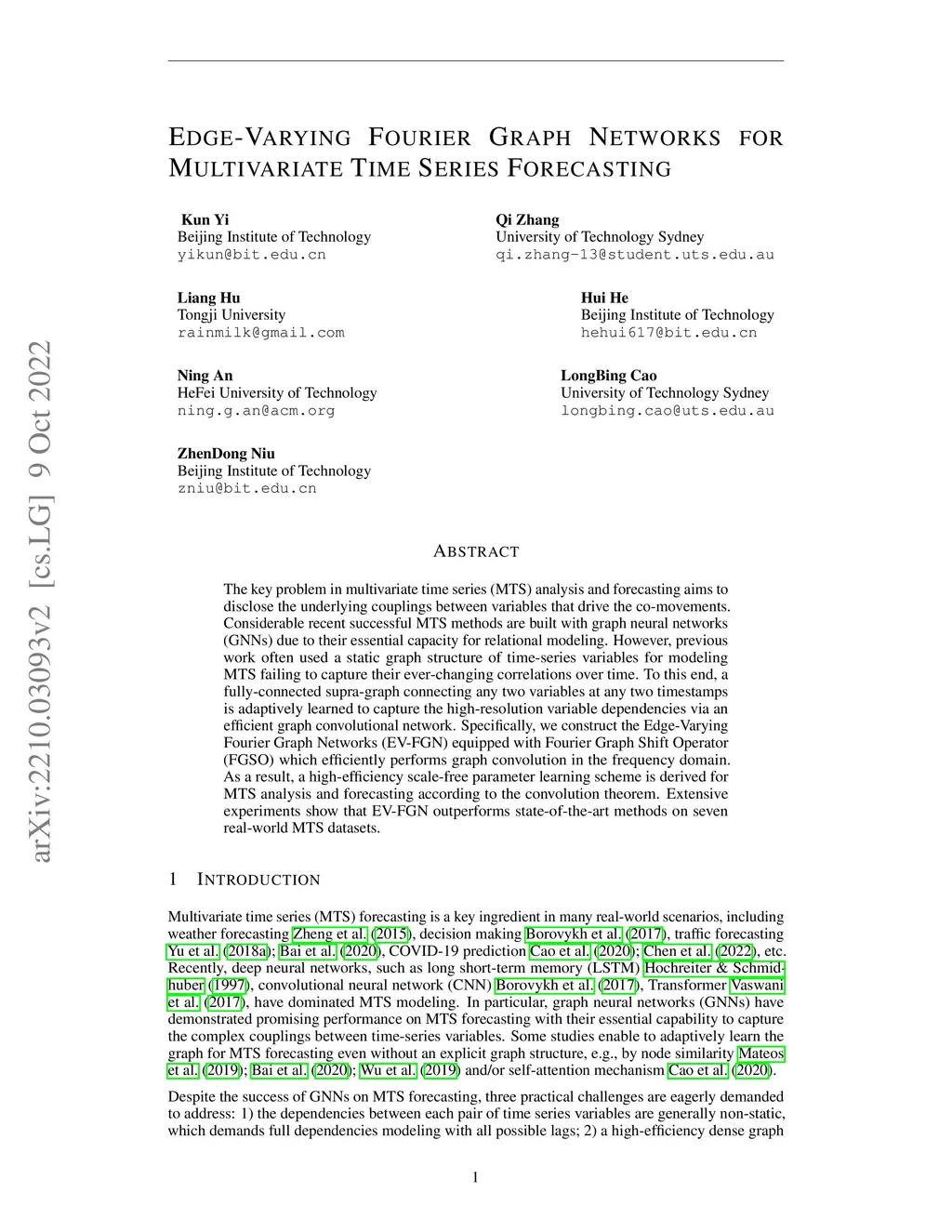The key problem in multivariate time series (MTS) analysis and forecasting aims to disclose the underlying couplings between variables that drive the co-movements. Considerable recent successful MTS methods are built with graph neural networks (GNNs) due to their essential capacity for relational modeling. However, previous work often used a static graph structure of time-series variables for modeling MTS failing to capture their ever-changing correlations over time. To this end, a fully-connected supra-graph connecting any two variables at any two timestamps is adaptively learned to capture the high-resolution variable dependencies via an efficient graph convolutional network. Specifically, we construct the Edge-Varying Fourier Graph Networks (EV-FGN) equipped with Fourier Graph Shift Operator (FGSO) which efficiently performs graph convolution in the frequency domain. As a result, a high-efficiency scale-free parameter learning scheme is derived for MTS analysis and forecasting according to the convolution theorem. Extensive experiments show that EV-FGN outperforms state-of-the-art methods on seven real-world MTS datasets.