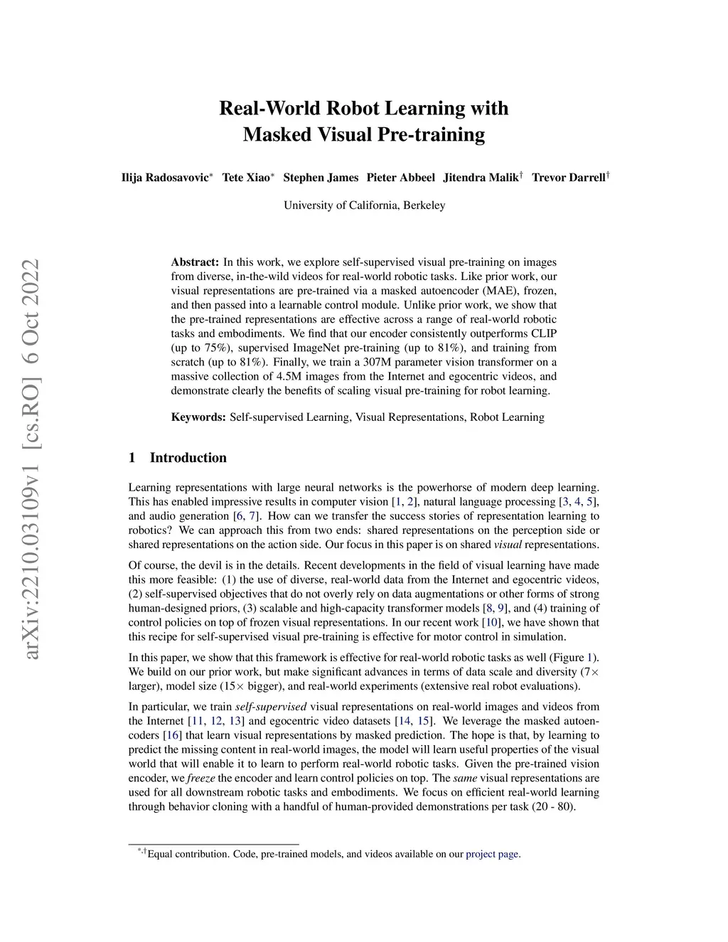 Real-World Robot Learning with Masked Visual Pre-training