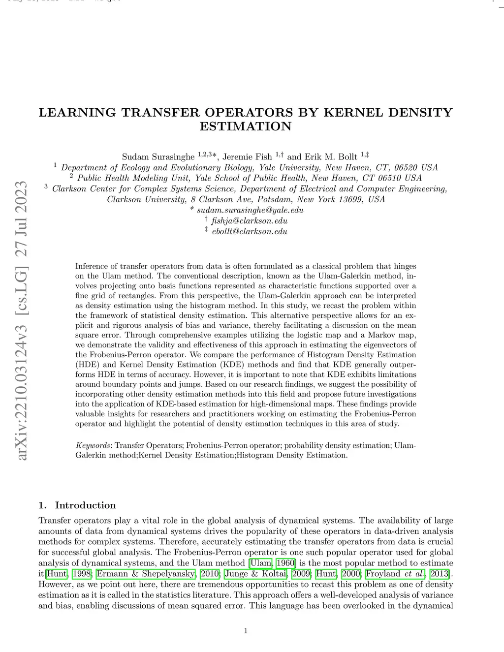 Inference of transfer operators from data is often formulated as a classical problem that hinges on the Ulam method. The conventional description, known as the Ulam-Galerkin method, involves projecting onto basis functions represented as characteristic functions supported over a fine grid of rectangles. From this perspective, the Ulam-Galerkin approach can be interpreted as density estimation using the histogram method. In this study, we recast the problem within the framework of statistical density estimation. This alternative perspective allows for an explicit and rigorous analysis of bias and variance, thereby facilitating a discussion on the mean square error. Through comprehensive examples utilizing the logistic map and a Markov map, we demonstrate the validity and effectiveness of this approach in estimating the eigenvectors of the Frobenius-Perron operator. We compare the performance of Histogram Density Estimation(HDE) and Kernel Density Estimation(KDE) methods and find that KDE generally outperforms HDE in terms of accuracy. However, it is important to note that KDE exhibits limitations around boundary points and jumps. Based on our research findings, we suggest the possibility of incorporating other density estimation methods into this field and propose future investigations into the application of KDE-based estimation for high-dimensional maps. These findings provide valuable insights for researchers and practitioners working on estimating the Frobenius-Perron operator and highlight the potential of density estimation techniques in this area of study. Keywords: Transfer Operators; Frobenius-Perron operator; probability density estimation; Ulam-Galerkin method; Kernel Density Estimation; Histogram Density Estimation.