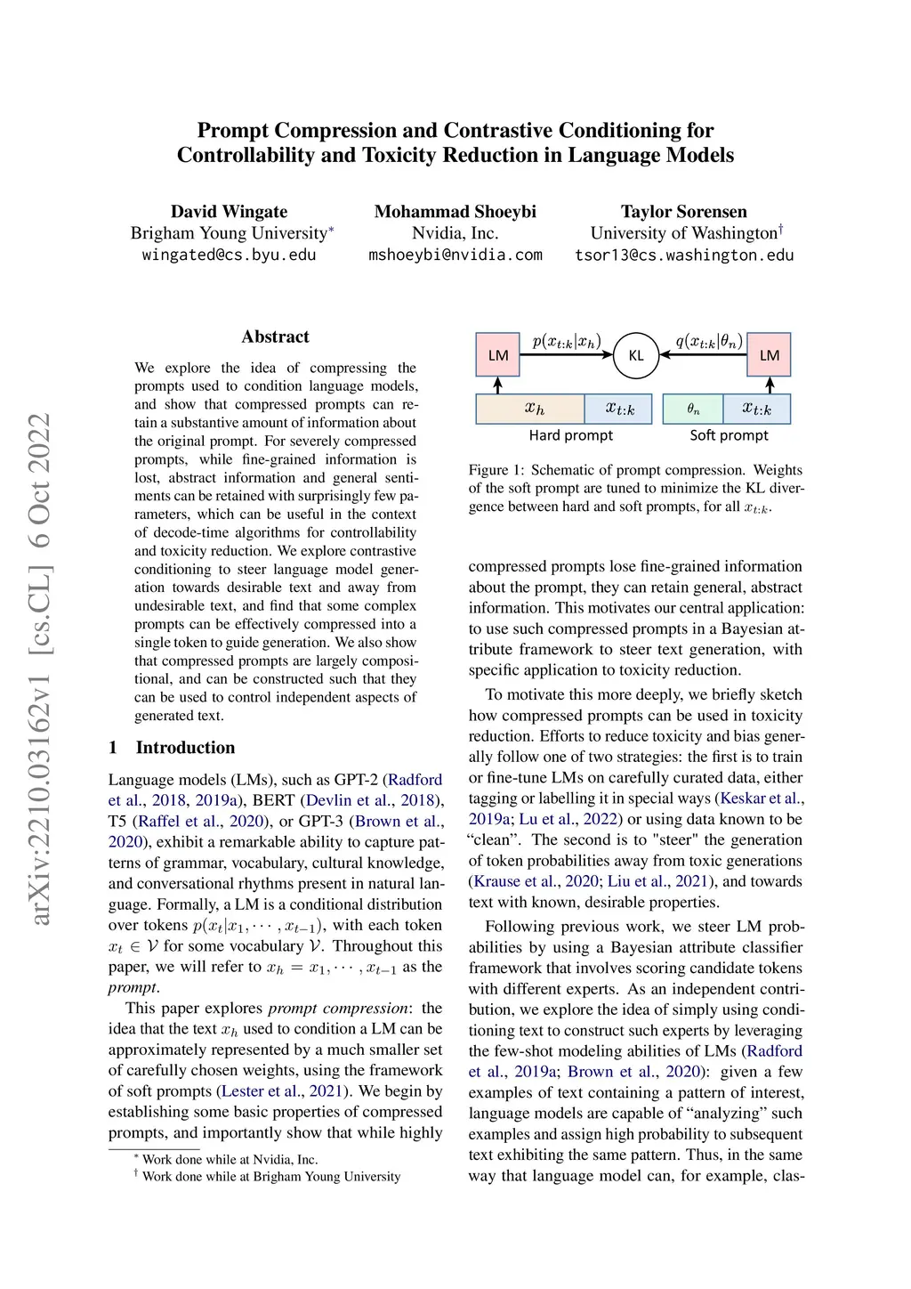 We explore the idea of compressing the prompts used to condition language models, and show that compressed prompts can retain a substantive amount of information about the original prompt. For severely compressed prompts, while fine-grained information is lost, abstract information and general sentiments can be retained with surprisingly few parameters, which can be useful in the context of decode-time algorithms for controllability and toxicity reduction. We explore contrastive conditioning to steer language model generation towards desirable text and away from undesirable text, and find that some complex prompts can be effectively compressed into a single token to guide generation. We also show that compressed prompts are largely compositional, and can be constructed such that they can be used to control independent aspects of generated text.