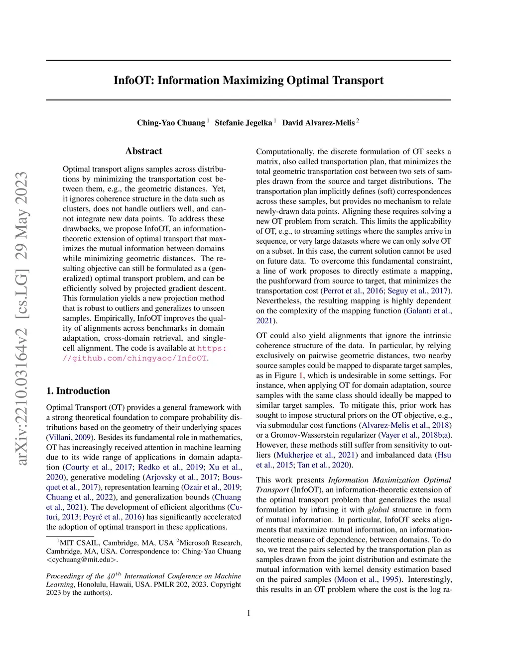 Optimal transport aligns samples across distributions by minimizing the transportation cost between them, e.g., the geometric distances. Yet, it ignores coherence structure in the data such as clusters, does not handle outliers well, and cannot integrate new data points. To address these drawbacks, we propose InfoOT, an information-theoretic extension of optimal transport that maximizes the mutual information between domains while minimizing geometric distances. The resulting objective can still be formulated as a (generalized) optimal transport problem, and can be efficiently solved by projected gradient descent. This formulation yields a new projection method that is robust to outliers and generalizes to unseen samples. Empirically, InfoOT improves the quality of alignments across benchmarks in domain adaptation, cross-domain retrieval, and single-cell alignment.