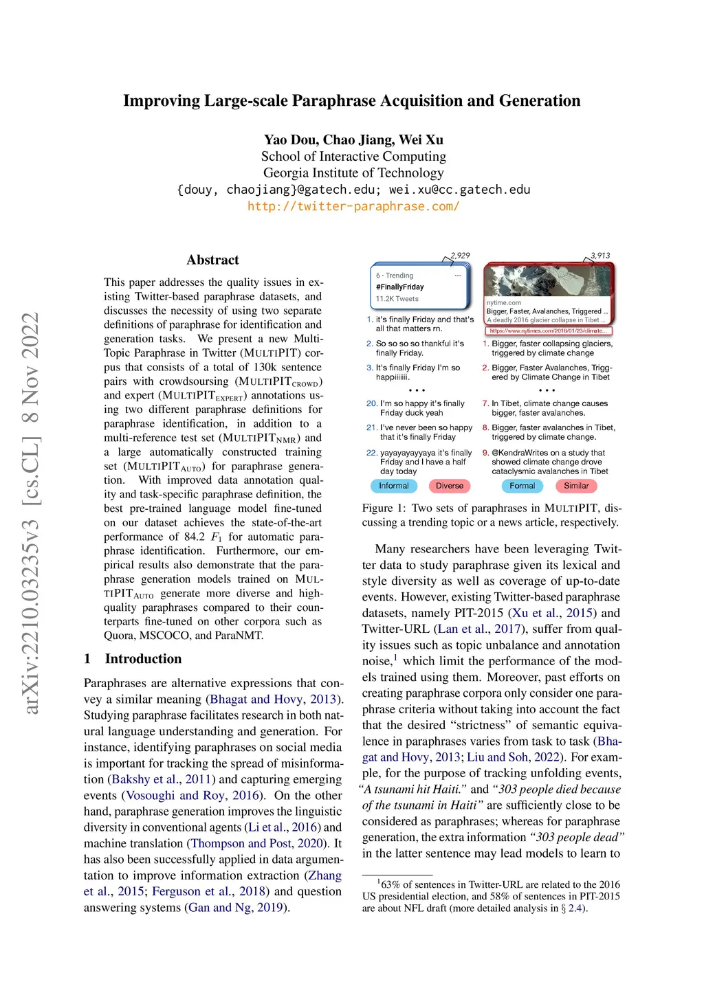 This paper addresses the quality issues in existing Twitter-based paraphrase datasets, and discusses the necessity of using two separate definitions of paraphrase for identification and generation tasks. We present a new Multi-Topic Paraphrase in Twitter (MultiPIT) corpus that consists of a total of 130k sentence pairs with crowdsoursing (MultiPIT_crowd) and expert (MultiPIT_expert) annotations using two different paraphrase definitions for paraphrase identification, in addition to a multi-reference test set (MultiPIT_NMR) and a large automatically constructed training set (MultiPIT_Auto) for paraphrase generation. With improved data annotation quality and task-specific paraphrase definition, the best pre-trained language model fine-tuned on our dataset achieves the state-of-the-art performance of 84.2 F1 for automatic paraphrase identification. Furthermore, our empirical results also demonstrate that the paraphrase generation models trained on MultiPIT_Auto generate more diverse and high-quality paraphrases compared to their counterparts fine-tuned on other corpora such as Quora, MSCOCO, and ParaNMT.