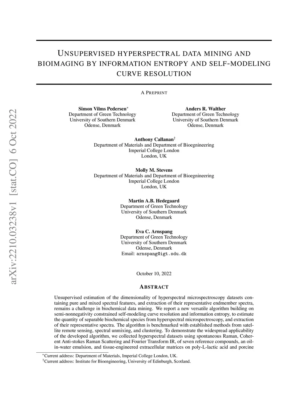 Unsupervised estimation of the dimensionality of hyperspectral microspectroscopy datasets containing pure and mixed spectral features, and extraction of their representative endmember spectra, remains a challenge in biochemical data mining. We report a new versatile algorithm building on semi-nonnegativity constrained self-modeling curve resolution and information entropy, to estimate the quantity of separable biochemical species from hyperspectral microspectroscopy, and extraction of their representative spectra. The algorithm is benchmarked with established methods from satellite remote sensing, spectral unmixing, and clustering. To demonstrate the widespread applicability of the developed algorithm, we collected hyperspectral datasets using spontaneous Raman, Coherent Anti-stokes Raman Scattering and Fourier Transform IR, of seven reference compounds, an oil-in-water emulsion, and tissue-engineered extracellular matrices on poly-L-lactic acid and porcine jejunum-derived small intestine submucosa scaffolds seeded with bovine chondrocytes. We show the potential of the developed algorithm by consolidating hyperspectral molecular information with sample microstructure, pertinent to fields ranging from gastrophysics to regenerative medicine.