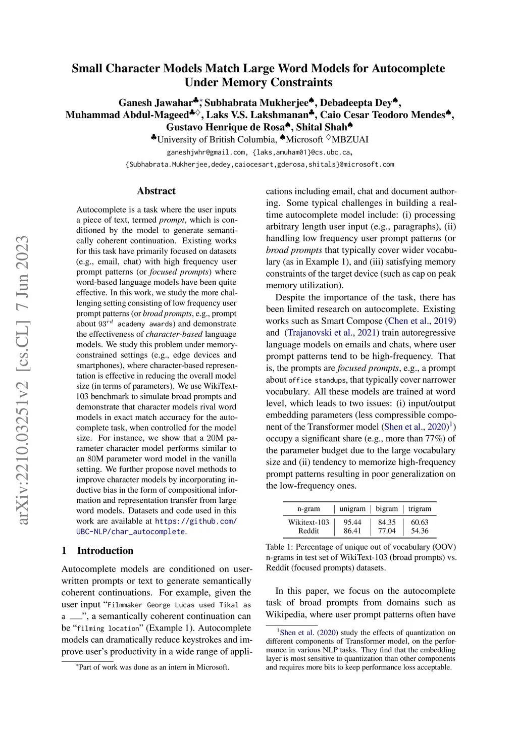 Autocomplete is a task where the user inputs a piece of text, termed prompt, which is conditioned by the model to generate semantically coherent continuation. Existing works for this task have primarily focused on datasets (e.g., email, chat) with high frequency user prompt patterns (or focused prompts) where word-based language models have been quite effective. In this work, we study the more challenging open-domain setting consisting of low frequency user prompt patterns (or broad prompts, e.g., prompt about 93rd academy awards) and demonstrate the effectiveness of character-based language models. We study this problem under memory-constrained settings (e.g., edge devices and smartphones), where character-based representation is effective in reducing the overall model size (in terms of parameters). We use WikiText-103 benchmark to simulate broad prompts and demonstrate that character models rival word models in exact match accuracy for the autocomplete task, when controlled for the model size. For instance, we show that a 20M parameter character model performs similar to an 80M parameter word model in the vanilla setting. We further propose novel methods to improve character models by incorporating inductive bias in the form of compositional information and representation transfer from large word models. Datasets and code used in this work are available at https://github.com/UBC-NLP/char_autocomplete.