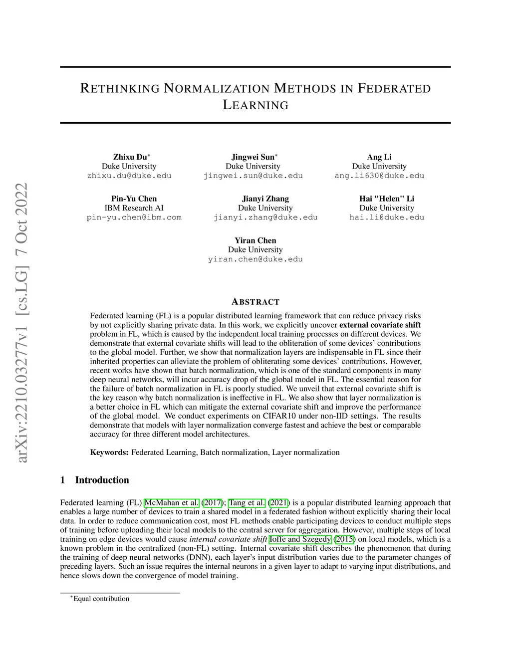 Federated learning (FL) is a popular distributed learning framework that can reduce privacy risks by not explicitly sharing private data. In this work, we explicitly uncover external covariate shift problem in FL, which is caused by the independent local training processes on different devices. We demonstrate that external covariate shifts will lead to the obliteration of some devices' contributions to the global model. Further, we show that normalization layers are indispensable in FL since their inherited properties can alleviate the problem of obliterating some devices' contributions. However, recent works have shown that batch normalization, which is one of the standard components in many deep neural networks, will incur accuracy drop of the global model in FL. The essential reason for the failure of batch normalization in FL is poorly studied. We unveil that external covariate shift is the key reason why batch normalization is ineffective in FL. We also show that layer normalization is a better choice in FL which can mitigate the external covariate shift and improve the performance of the global model. We conduct experiments on CIFAR10 under non-IID settings. The results demonstrate that models with layer normalization converge fastest and achieve the best or comparable accuracy for three different model architectures.