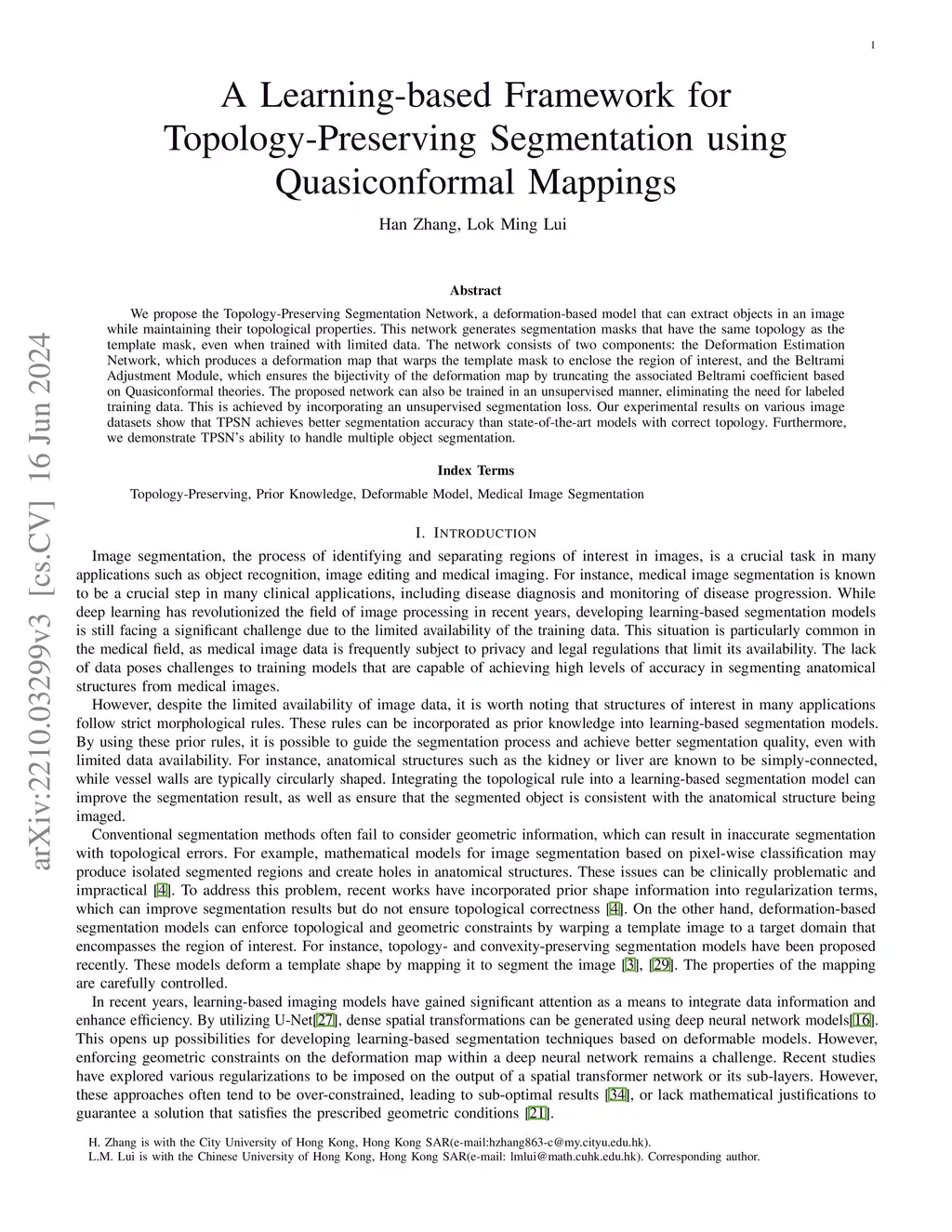 We propose the Topology-Preserving Segmentation Network, a deformation-based model that can extract objects in an image while maintaining their topological properties. This network generates segmentation masks that have the same topology as the template mask, even when trained with limited data. The network consists of two components: the Deformation Estimation Network, which produces a deformation map that warps the template mask to enclose the region of interest, and the Beltrami Adjustment Module, which ensures the bijectivity of the deformation map by truncating the associated Beltrami coefficient based on Quasiconformal theories. The proposed network can also be trained in an unsupervised manner, eliminating the need for labeled training data. This is achieved by incorporating an unsupervised segmentation loss. Our experimental results on various image datasets show that TPSN achieves better segmentation accuracy than state-of-the-art models with correct topology. Furthermore, we demonstrate TPSN's ability to handle multiple object segmentation.