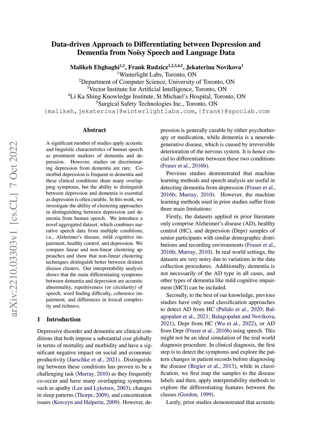 Data-driven Approach to Differentiating between Depression and Dementia