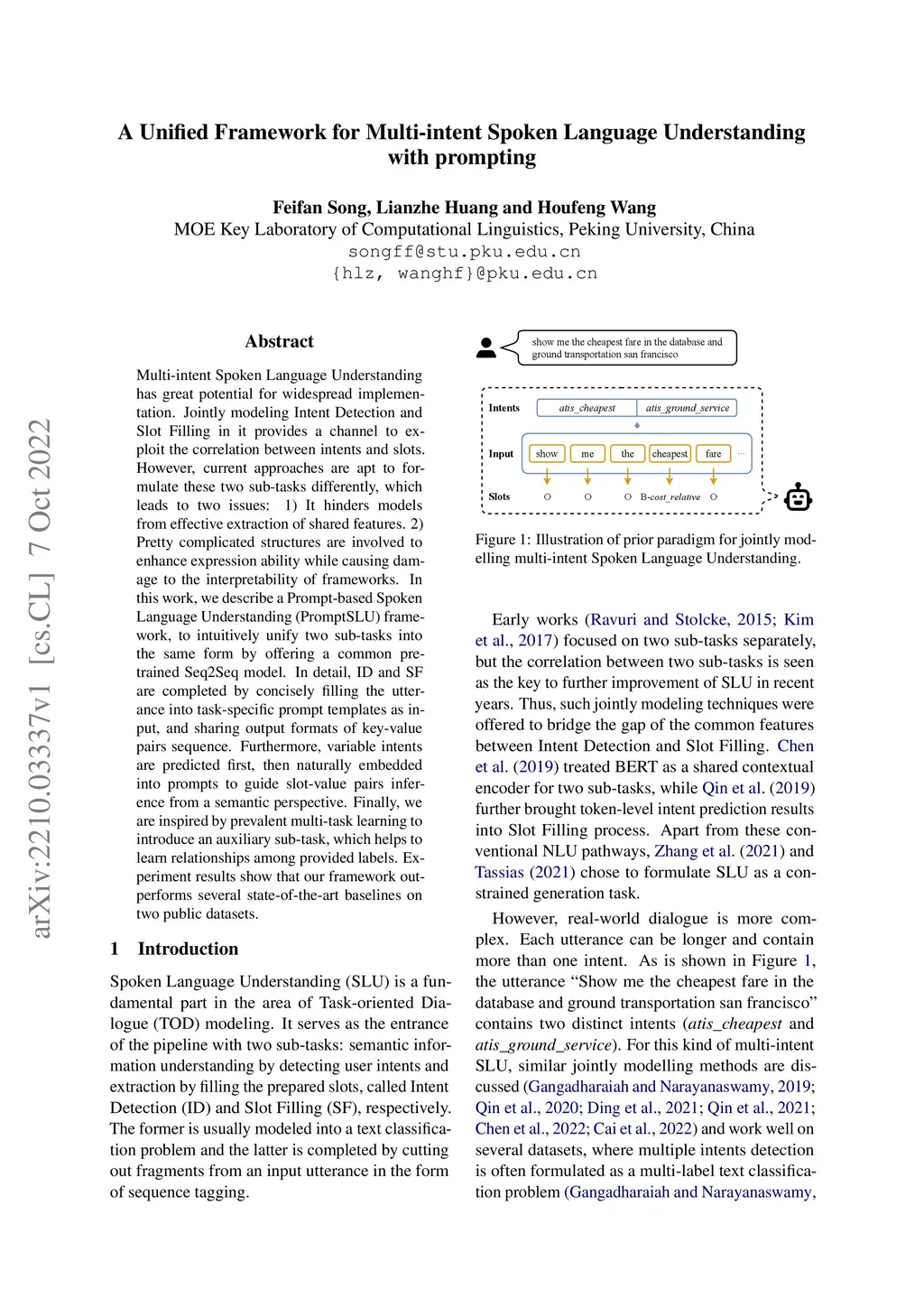 Multi-intent Spoken Language Understanding has great potential for widespread implementation. Jointly modeling Intent Detection and Slot Filling in it provides a channel to exploit the correlation between intents and slots. However, current approaches are apt to formulate these two sub-tasks differently, which leads to two issues: 1) It hinders models from effective extraction of shared features. 2) Pretty complicated structures are involved to enhance expression ability while causing damage to the interpretability of frameworks. In this work, we describe a Prompt-based Spoken Language Understanding (PromptSLU) framework, to intuitively unify two sub-tasks into the same form by offering a common pre-trained Seq2Seq model. In detail, ID and SF are completed by concisely filling the utterance into task-specific prompt templates as input, and sharing output formats of key-value pairs sequence. Furthermore, variable intents are predicted first, then naturally embedded into prompts to guide slot-value pairs inference from a semantic perspective. Finally, we are inspired by prevalent multi-task learning to introduce an auxiliary sub-task, which helps to learn relationships among provided labels. Experiment results show that our framework outperforms several state-of-the-art baselines on two public datasets.