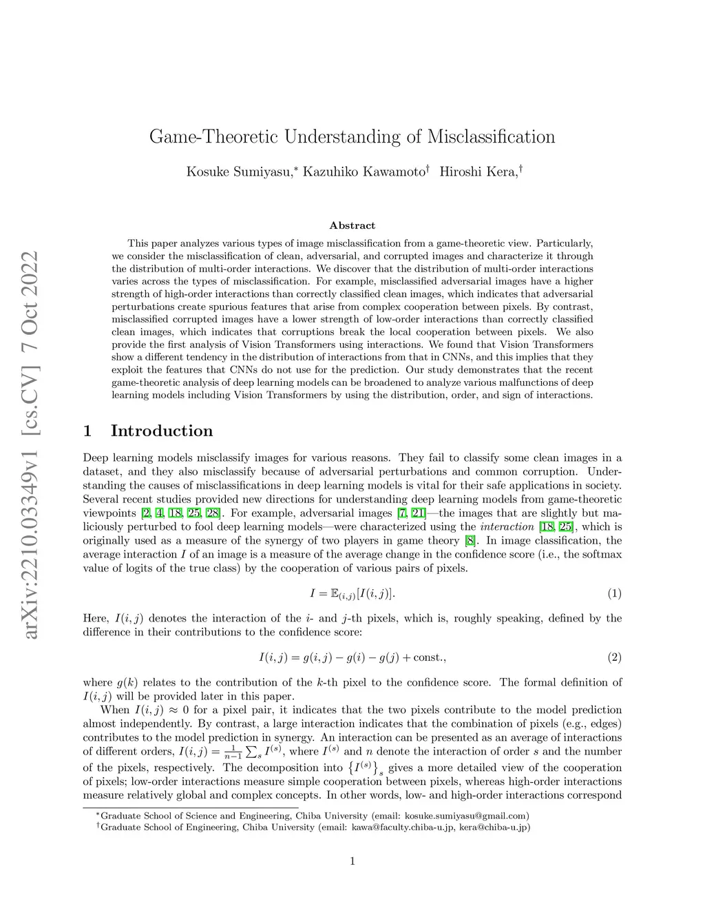 This paper analyzes various types of image misclassification from a game-theoretic view. Particularly, we consider the misclassification of clean, adversarial, and corrupted images and characterize it through the distribution of multi-order interactions. We discover that the distribution of multi-order interactions varies across the types of misclassification. For example, misclassified adversarial images have a higher strength of high-order interactions than correctly classified clean images, which indicates that adversarial perturbations create spurious features that arise from complex cooperation between pixels. By contrast, misclassified corrupted images have a lower strength of low-order interactions than correctly classified clean images, which indicates that corruptions break the local cooperation between pixels. We also provide the first analysis of Vision Transformers using interactions. We found that Vision Transformers show a different tendency in the distribution of interactions from that in CNNs, and this implies that they exploit the features that CNNs do not use for the prediction. Our study demonstrates that the recent game-theoretic analysis of deep learning models can be broadened to analyze various malfunctions of deep learning models including Vision Transformers by using the distribution, order, and sign of interactions.