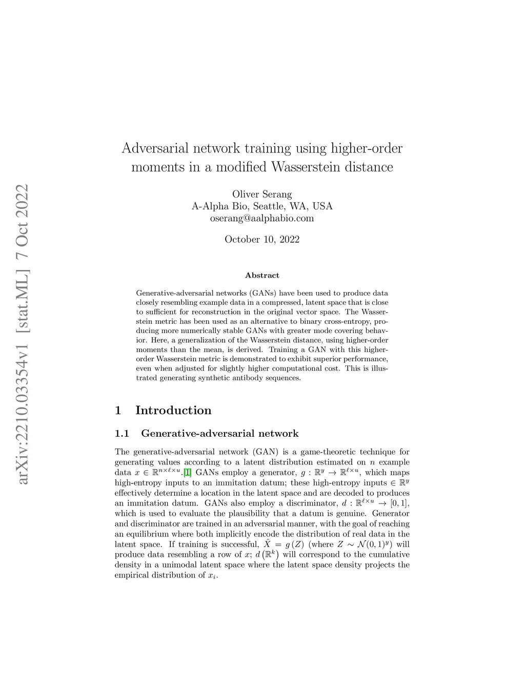 Generative-adversarial networks (GANs) have been used to produce data closely resembling example data in a compressed, latent space that is close to sufficient for reconstruction in the original vector space. The Wasserstein metric has been used as an alternative to binary cross-entropy, producing more numerically stable GANs with greater mode covering behavior. Here, a generalization of the Wasserstein distance, using higher-order moments than the mean, is derived. Training a GAN with this higher-order Wasserstein metric is demonstrated to exhibit superior performance, even when adjusted for slightly higher computational cost. This is illustrated generating synthetic antibody sequences.