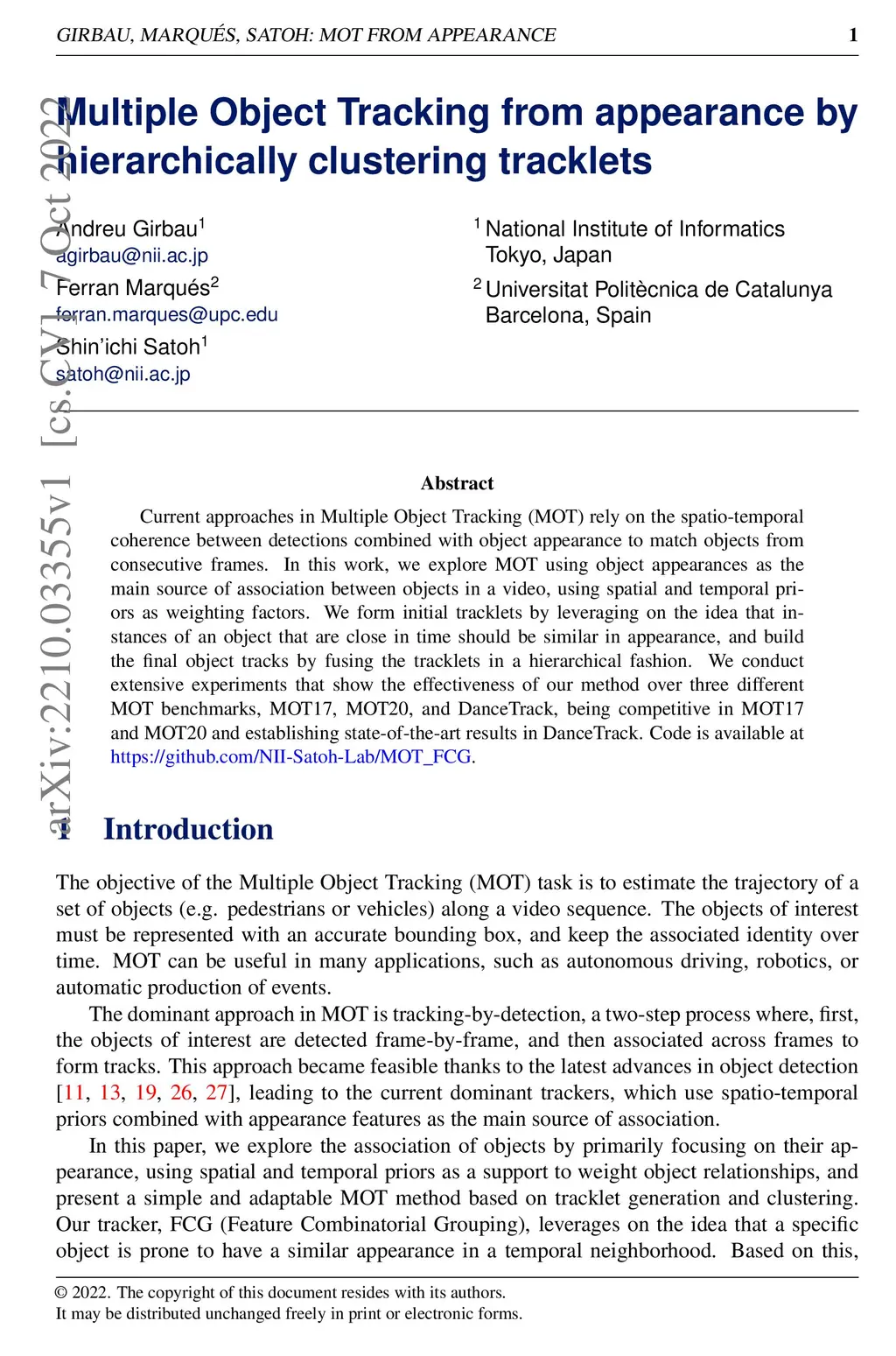 Current approaches in Multiple Object Tracking (MOT) rely on the spatio-temporal coherence between detections combined with object appearance to match objects from consecutive frames. In this work, we explore MOT using object appearances as the main source of association between objects in a video, using spatial and temporal priors as weighting factors. We form initial tracklets by leveraging on the idea that instances of an object that are close in time should be similar in appearance, and build the final object tracks by fusing the tracklets in a hierarchical fashion. We conduct extensive experiments that show the effectiveness of our method over three different MOT benchmarks, MOT17, MOT20, and DanceTrack, being competitive in MOT17 and MOT20 and establishing state-of-the-art results in DanceTrack.