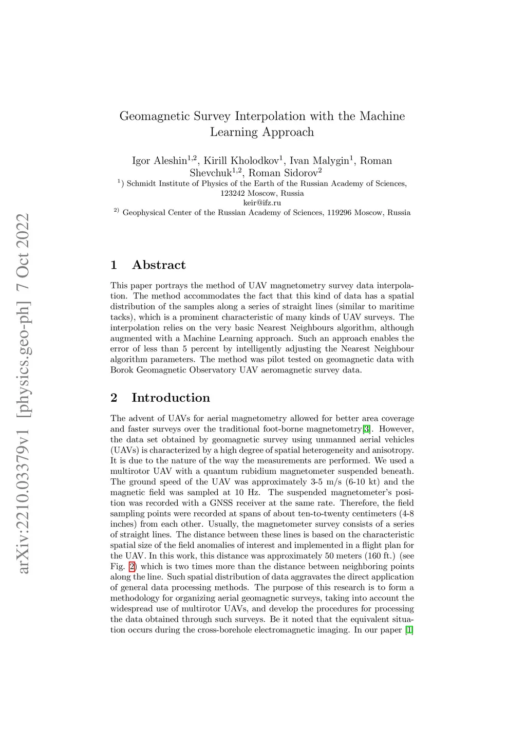 This paper portrays the method of UAV magnetometry survey data interpolation. The method accommodates the fact that this kind of data has a spatial distribution of the samples along a series of straight lines (similar to maritime tacks), which is a prominent characteristic of many kinds of UAV surveys. The interpolation relies on the very basic Nearest Neighbours algorithm, although augmented with a Machine Learning approach. Such an approach enables the error of less than 5 percent by intelligently adjusting the Nearest Neighbour algorithm parameters. The method was pilot tested on geomagnetic data with Borok Geomagnetic Observatory UAV aeromagnetic survey data.