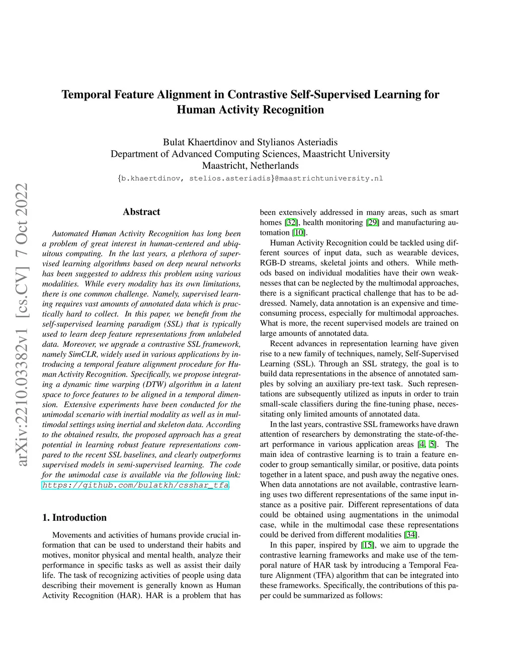 Automated Human Activity Recognition has long been a problem of great interest in human-centered and ubiquitous computing. In the last years, a plethora of supervised learning algorithms based on deep neural networks has been suggested to address this problem using various modalities. While every modality has its own limitations, there is one common challenge. Namely, supervised learning requires vast amounts of annotated data which is practically hard to collect. In this paper, we benefit from the self-supervised learning paradigm (SSL) that is typically used to learn deep feature representations from unlabeled data. Moreover, we upgrade a contrastive SSL framework, namely SimCLR, widely used in various applications by introducing a temporal feature alignment procedure for Human Activity Recognition. Specifically, we propose integrating a dynamic time warping (DTW) algorithm in a latent space to force features to be aligned in a temporal dimension. Extensive experiments have been conducted for the unimodal scenario with inertial modality as well as in multimodal settings using inertial and skeleton data. According to the obtained results, the proposed approach has a great potential in learning robust feature representations compared to the recent SSL baselines, and clearly outperforms supervised models in semi-supervised learning. The code for the unimodal case is available via the following link: https://github.com/bulatkh/csshar_tfa.