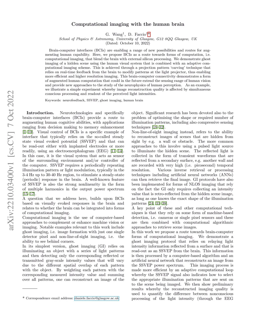 Brain-computer interfaces (BCIs) are enabling a range of new possibilities and routes for augmenting human capability. Here, we propose BCIs as a route towards forms of computation, i.e. computational imaging, that blend the brain with external silicon processing. We demonstrate ghost imaging of a hidden scene using the human visual system that is combined with an adaptive computational imaging scheme. This is achieved through a projection pattern `carving' technique that relies on real-time feedback from the brain to modify patterns at the light projector, thus enabling more efficient and higher resolution imaging. This brain-computer connectivity demonstrates a form of augmented human computation that could in the future extend the sensing range of human vision and provide new approaches to the study of the neurophysics of human perception. As an example, we illustrate a simple experiment whereby image reconstruction quality is affected by simultaneous conscious processing and readout of the perceived light intensities.