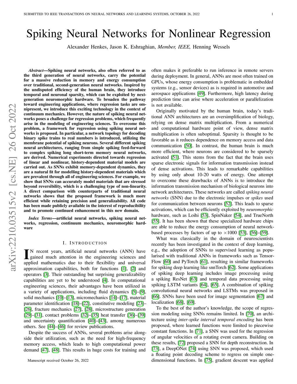 Spiking neural networks, also often referred to as the third generation of neural networks, carry the potential for a massive reduction in memory and energy consumption over traditional, second-generation neural networks. Inspired by the undisputed efficiency of the human brain, they introduce temporal and neuronal sparsity, which can be exploited by next-generation neuromorphic hardware. To open the pathway toward engineering applications, we introduce this exciting technology in the context of continuum mechanics. However, the nature of spiking neural networks poses a challenge for regression problems, which frequently arise in the modeling of engineering sciences. To overcome this problem, a framework for regression using spiking neural networks is proposed. In particular, a network topology for decoding binary spike trains to real numbers is introduced, utilizing the membrane potential of spiking neurons. As the aim of this contribution is a concise introduction to this new methodology, several different spiking neural architectures, ranging from simple spiking feed-forward to complex spiking long short-term memory neural networks, are derived. Several numerical experiments directed towards regression of linear and nonlinear, history-dependent material models are carried out. A direct comparison with counterparts of traditional neural networks shows that the proposed framework is much more efficient while retaining precision and generalizability. All code has been made publicly available in the interest of reproducibility and to promote continued enhancement in this new domain.