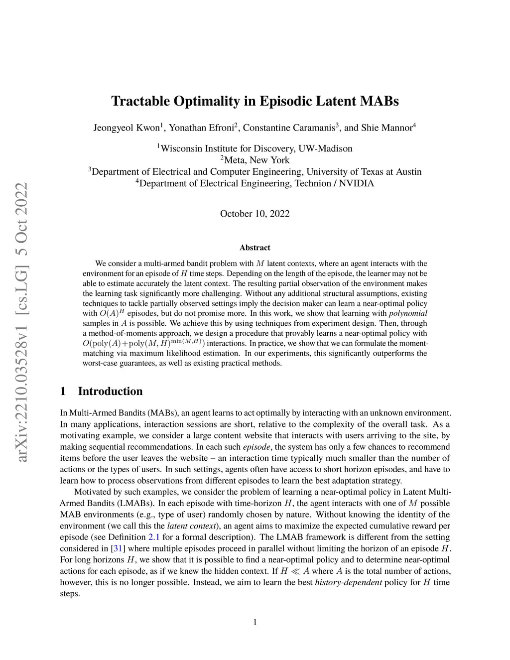 We consider a multi-armed bandit problem with latent contexts, where an agent interacts with the environment for an episode of time steps. Depending on the length of the episode, the learner may not be able to estimate accurately the latent context. The resulting partial observation of the environment makes the learning task significantly more challenging. Without any additional structural assumptions, existing techniques to tackle partially observed settings imply the decision maker can learn a near-optimal policy with episodes, but do not promise more. In this work, we show that learning with {\em polynomial} samples in is possible. We achieve this by using techniques from experiment design. Then, through a method-of-moments approach, we design a procedure that provably learns a near-optimal policy with interactions. In practice, we show that we can formulate the moment-matching via maximum likelihood estimation. In our experiments, this significantly outperforms the worst-case guarantees, as well as existing practical methods.