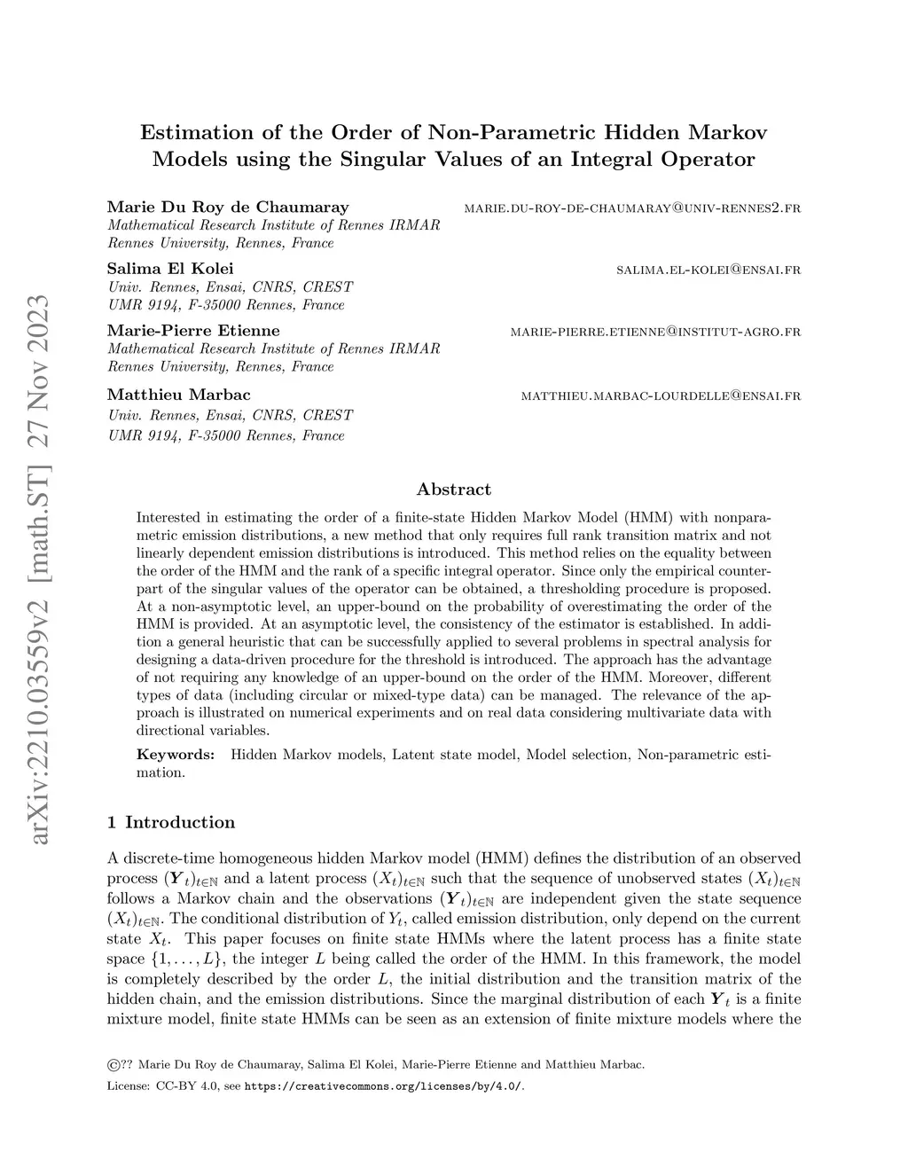 We are interested in assessing the order of a finite-state Hidden Markov Model (HMM) with the only two assumptions that the transition matrix of the latent Markov chain has full rank and that the density functions of the emission distributions are linearly independent. We introduce a new procedure for estimating this order by investigating the rank of some well-chosen integral operator which relies on the distribution of a pair of consecutive observations. This method circumvents the usual limits of the spectral method when it is used for estimating the order of an HMM: it avoids the choice of the basis functions; it does not require any knowledge of an upper-bound on the order of the HMM (for the spectral method, such an upper-bound is defined by the number of basis functions); it permits to easily handle different types of data (including continuous data, circular data or multivariate continuous data) with a suitable choice of kernel. The method relies on the fact that the order of the HMM can be identified from the distribution of a pair of consecutive observations and that this order is equal to the rank of some integral operator (\emph{i.e.} the number of its singular values that are non-zero). Since only the empirical counter-part of the singular values of the operator can be obtained, we propose a data-driven thresholding procedure. An upper-bound on the probability of overestimating the order of the HMM is established. Moreover, sufficient conditions on the bandwidth used for kernel density estimation and on the threshold are stated to obtain the consistency of the estimator of the order of the HMM. The procedure is easily implemented since the values of all the tuning parameters are determined by the sample size.